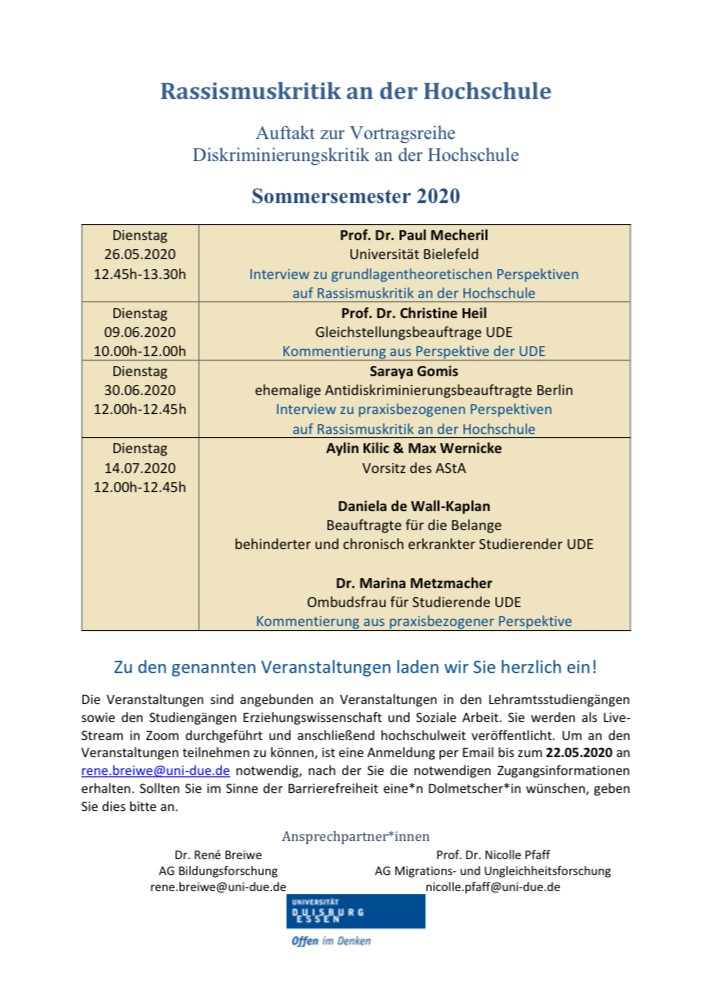In der Auseinandersetzung um Diskriminierung an Hochschulen gehen Studierende aus bildungswissenschaftlichen Studiengängen des Lehramts, der Sozialen Arbeit und der Erziehungswissenschaft der Frage nach Perspektiven der ‚Rassismuskritik an der Hochschule' nach. Dazu sprechen sie unterstützt durch die Fakultät für Bildungswissenschaften mit in- und externen Expert*innen aus dem Feld. Zum Auftakt führen die Studierenden in gemeinsamer Moderation mit Nicolle Pfaff und René Breiwe aus zwei bildungswissenschaftlichen Seminaren am Diversity-Tag der Universität Duisburg-Essen am 26.05.2020, in der Zeit von 12:45-13.30 Uhr, ein Interview mit dem bekannten Bielefelder Migrationspädagogen Paul Mecheril. Falls Sie an dem online stattfindenden Gespräch teilnehmen möchten, melden Sie sich bitte bis zum 22.05.2020 bei Dr. René Breiwe (rene.breiwe@uni-due.de) an.