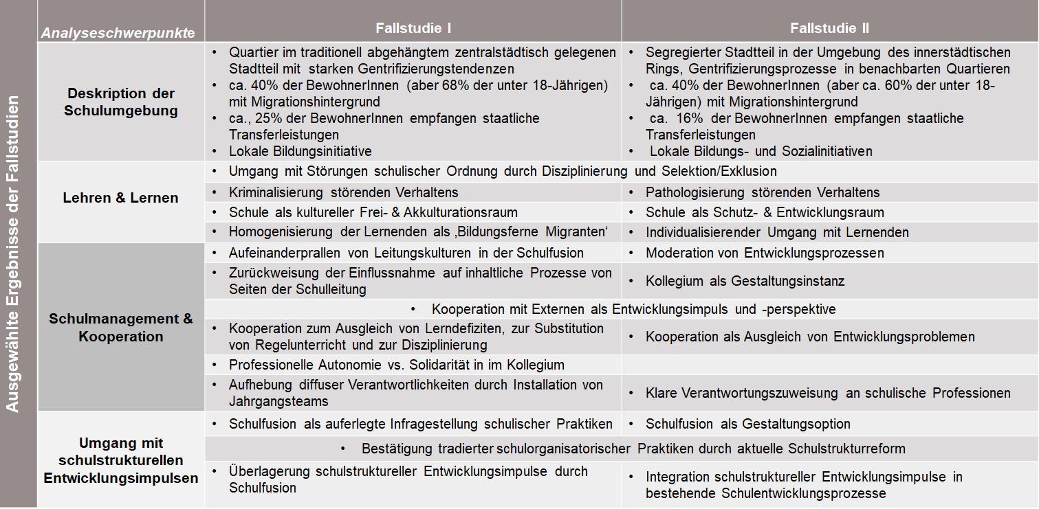 Fallkontrastive Analysen im Projekt verweisen zunächst auf die Bedeutung der Einzelschule bei der bildungsbezogenen Integration von Lernenden in segregierten Quartieren. Die von uns untersuchten Schulen haben im Zuge der Auseinandersetzung mit ihrer Schülerklientel, im Kontext der Teilnahme an Schulmodellprojekten sowie in Zusammenarbeit mit verschiedenen schulischen und außerschulischen Akteuren über lange Zeiträume hinweg spezifische tradierte Praktiken der Bewältigung von bildungsbezogener, sozialer und ethnischer Segregation ihrer Schülerschaften entwickelt. Die nachfogende Tabelle gibt einen Überblick über die Resultate zu beiden Fallstudien, m Anschluss daran sind wichtige Ergebnisse exemplarisch für die verschiedenen Analysefoki generalisierend beschrieben.