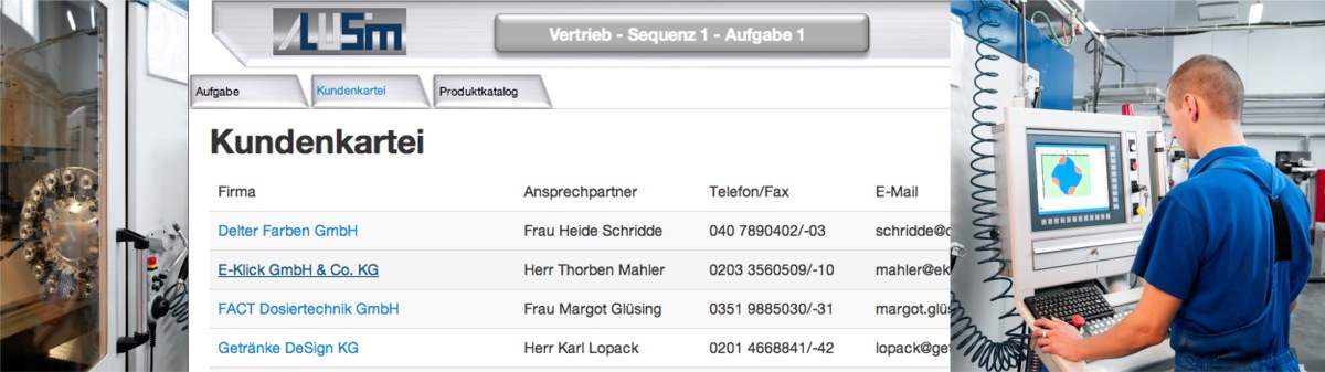Das Unternehmen enthält (a) eine Unternehmensbeschreibung und (b) die Einführung in die ALUSIM-Testumgebung. Alle zur Testdurchführung notwendigen Information werden eingeführt und anhand von Beispielen erläutert. Die Testteilnehmer:innen übernehmen im Verlauf der Testung die Rollen von Auszubildenden der ALUSIM GmbH und navigieren durch die verschiedenen Unternehmensabteilungen.