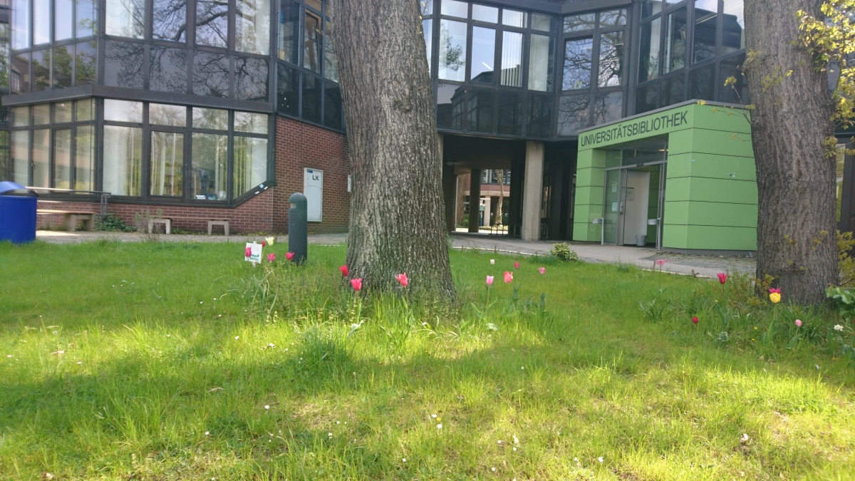 Unsere achteckige Rasenfläche ist manchmal ganz schön wild: sprießende Blumenzwiebeln im Frühjahr, hohes Gras im Sommer, herabfallendes Laub im Herbst, frostgebeutelter Rasen im Winter. Wir pflegen und mähen das Oktogon regelmäßig, überlassen es aber auch gern zwischendurch den Jahreszeiten, um die Biodiversität am Campus zu fördern. Dazu gehören blühende Krokusse genauso wie verwelktes Gras. Bitte schätzt unser kleines Biotop und seinen jahreszeitlichen Wandel!