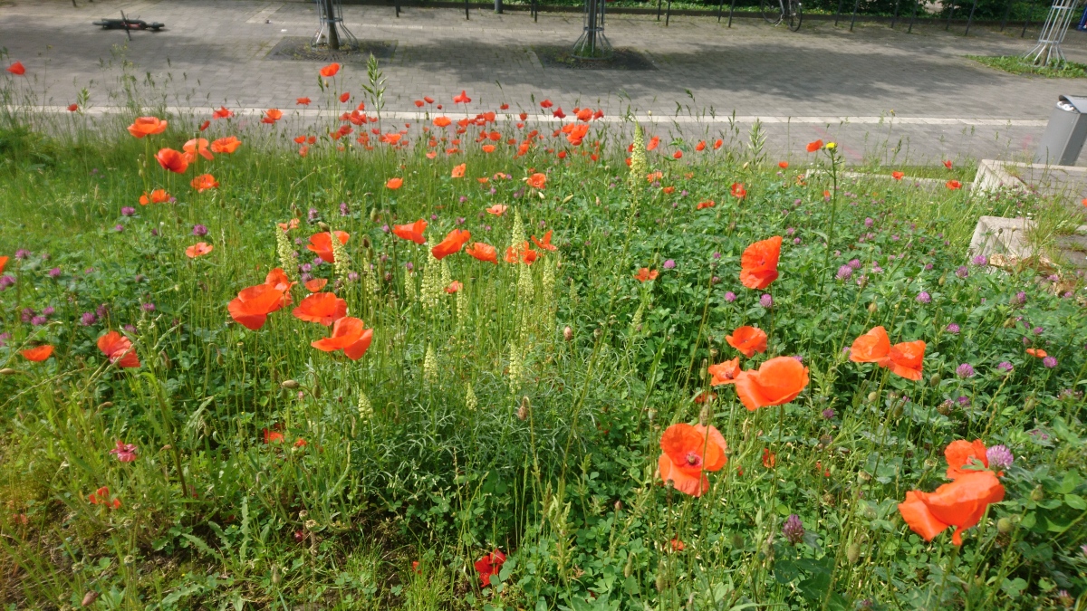 Die Wiese um LX herum kann im Sommer ganz schön wild aussehen: hier blühen Mohn, Kamille, Gänseblümchen, Klee und noch viel mehr! Diese Pflanzen halten Nektar und Pollen für Insekten bereit, wodurch sie einen wichtigen Beitrag zum Erhalt der Biodiversität in der Umgebung leistet. Deshalb haben wir mit dem Gebäudemanagement vereinbart, dass ein Großteil der Wiese noch etwas länger blühen darf bis die Insekten ihren Bedarf gedeckt haben. Zur wilden Wiese gehören deshalb zwischendurch auch verwelkte oder vertrocknete Halme. Habt deshalb bitte Verständnis, wenn die Wiese zeitweise etwas wilder aussieht und erst im Spätsommer gemäht wird.