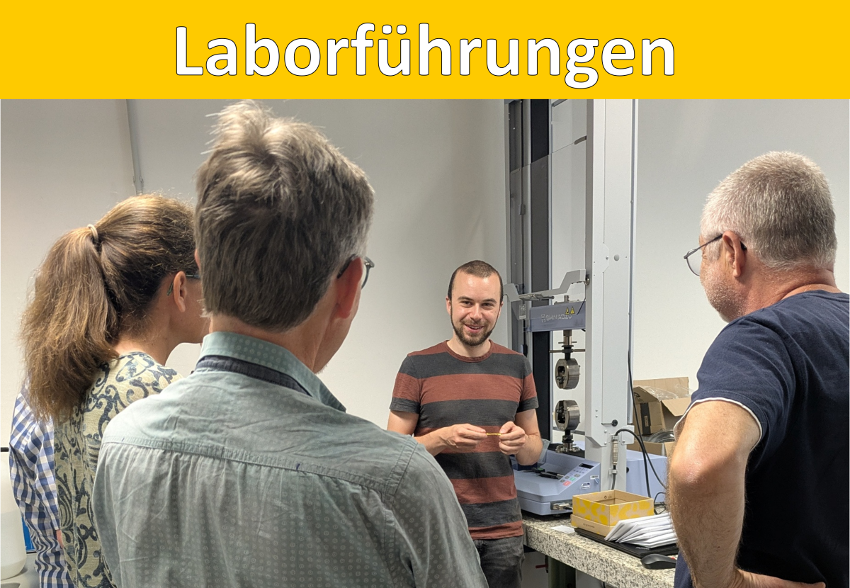 Ein gelber Balken mit der Überschrift Laborführungen. Darunter ein Bild von einer Person die vor einer Menschengruppe ein Gerät in einem Labor erklärt.