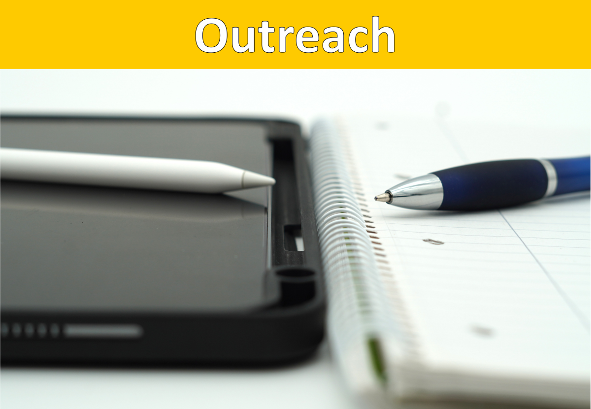 Ein gelber Balken mit der Überschrift Outreach. Darunter ein Bild von einem Block und einem Tablet mit den dazugehörigen Stiften.