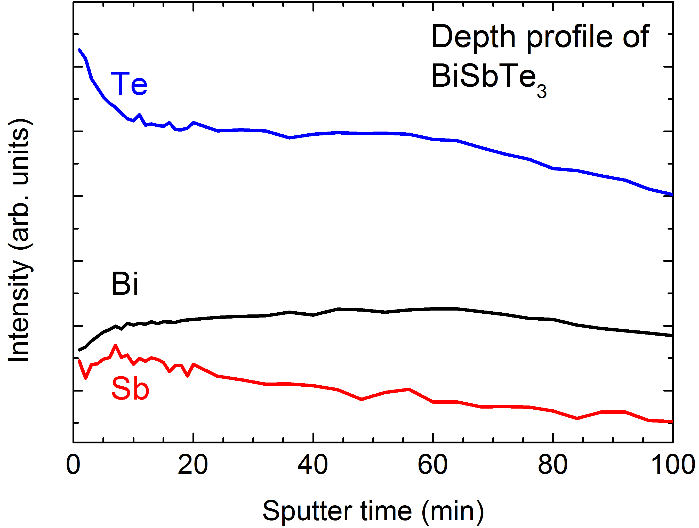 Weiterhin kann man Tiefenprofile aufnehmen. Nach jedem Sputter-Schritt wird die XPS Intensität des Signals der zu untersuchenden Elemente bestimmt. Kennt man die Sputterrate kann man die Änderung der Elementkonzentration mit zunehmender Probentiefe bestimmen. Ein Beispiel ist in Abbildung 6 zu sehen. Sie zeigt die Intensität von Bi,Sb und Te einer BiSbTe3 Schicht in Abhängigkeit der Sputterzeit. In diesem Fall sieht man, dass die Konzentration an Tellur und Antimon mit zunehmender Tiefe leicht abnimmt.