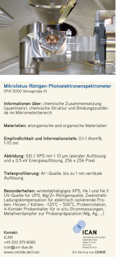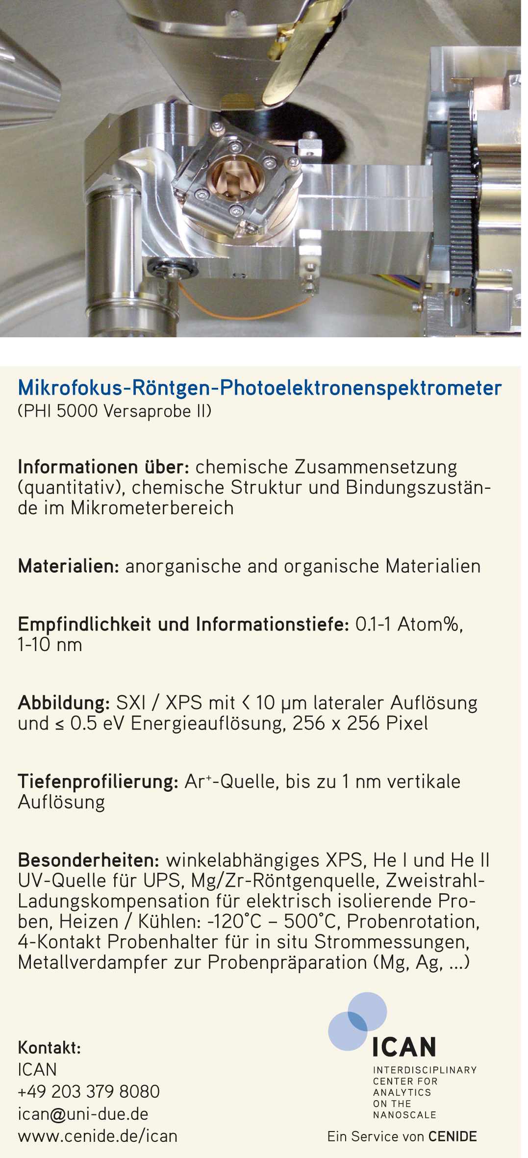 | Vorhandene Lichtquellen: | XPS-Dual Anode mit Mg Kα & Al Kα He-/ Ne- / Ar-Plasma UV Quelle |