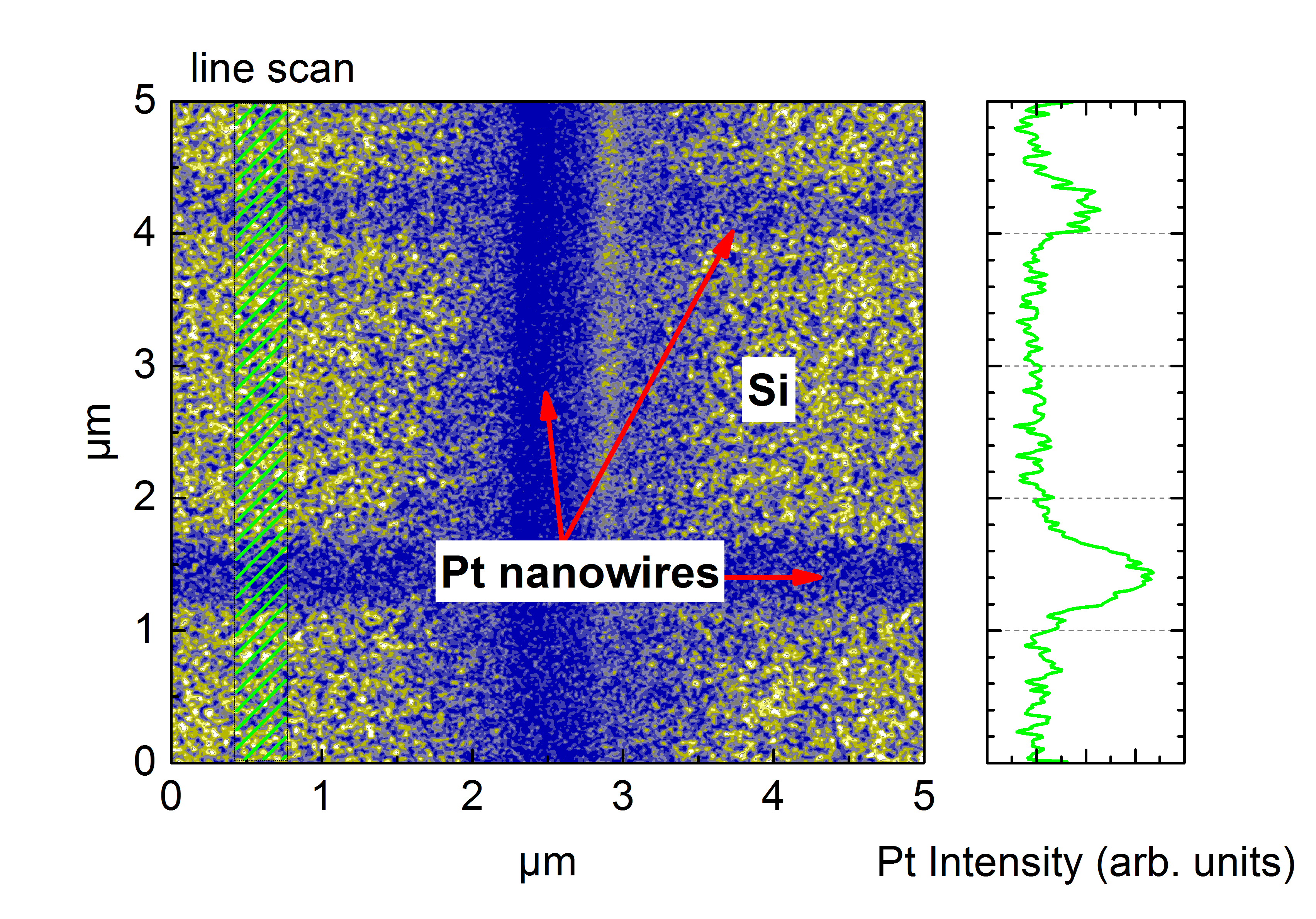 In Abbildung 2 sieht man Platin Nanodrähte (Höhe 20 nm, 50 nm (je quer), und 200nm (längs)), die in der FIB auf Siliziumsubstrat abgeschieden worden sind. Die Augerelektronen-Signale von Platin (blau) und Silizium (gelb) farblich übereinander gelegt. Das Diagramm am linken Rand zeigt die Intensität des Platinsignals eines Line Scan, in der 2D Karte dargestellt durch die grün schraffierte Fläche.