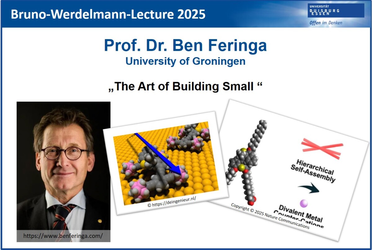 Die Bruno-Werdelmann-Vorlesung 2025 findet am 17.12.2025 um 17.15 Uhr in Hörsaal S07 S00 D07 statt. Wir freuen uns auf einen spannenden Vortrag von Nobelpreisträger Prof. Dr. Ben Feringa (University Groningen) zum Thema „The Art of Building Small“. Vor der Vorlesung findet ab 16.15 Uhr ein Kaffeetrinken im Foyer S07 S04 statt – Gäste sind herzlich eingeladen.