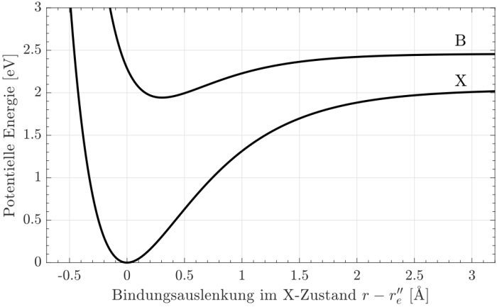 Abbildung: Im Rahmen des Praktikumsversuchs berechnete Potentialkurven von Iod für den Grundzustand X und den angeregten Zustand B.
