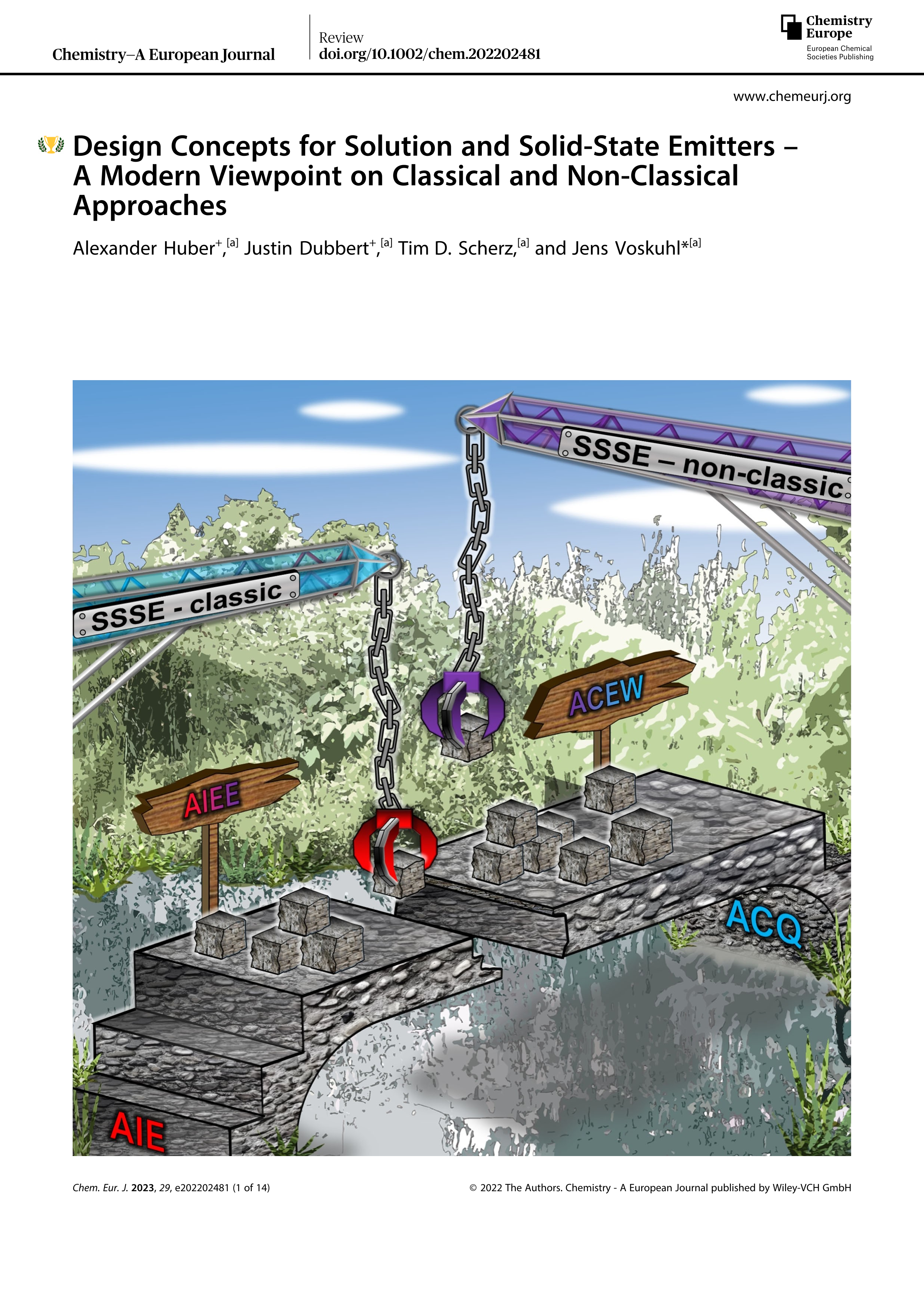 75. "Design concepts for solution and solid-state emitters – a modern viewpoint on classical and non-classical approaches", Chem. Eur. J., 2023, 29, e2022024, Alexander Huber, Justin Dubbert, Tim David Scherz, Jens Voskuhl*.