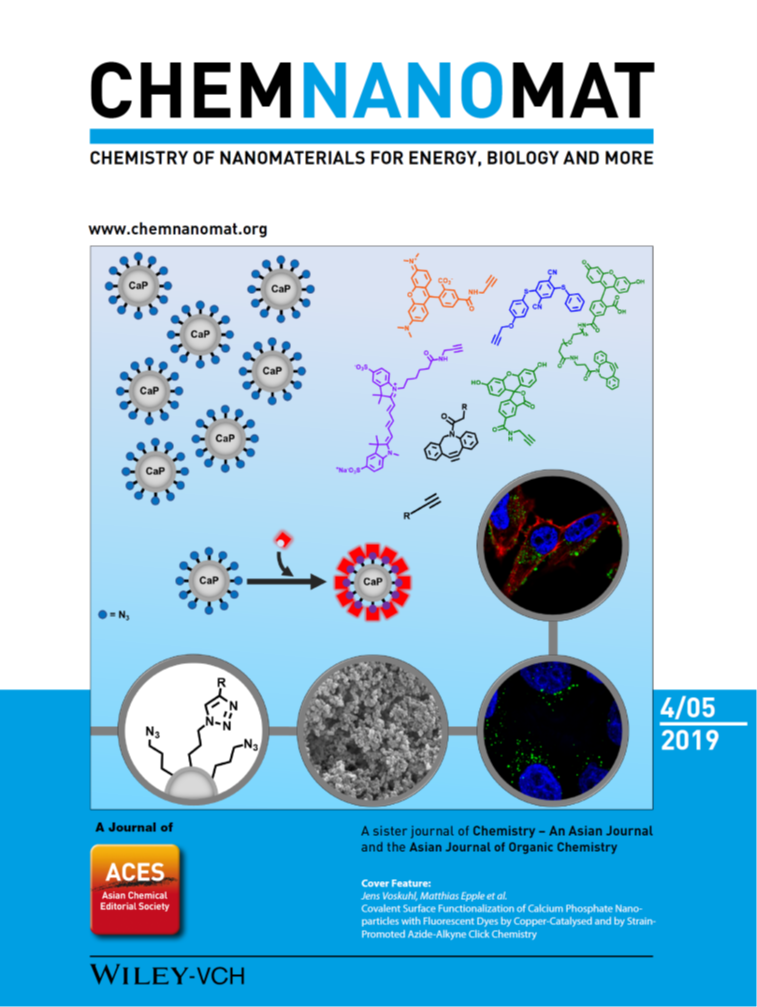 40. "Covalent surface functionalization of calcium phosphate nanoparticles with fluorescent dyes by copper-catalysed and by strain-promoted azide-alkyne click chemistry", ChemNanoMat, 2019, 5, 436-446, Leonardo Rojas-Sánchez, Viktoriya Sokolova, Steffen Riebe, Jens Voskuhl* and Matthias Epple*.