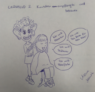 Die sechs farbigen Abbildungen wurden am Berufskolleg Neandertal im Fachunterricht mit Auszubildenden des Friseurhandwerks von Studiendirektorin Annette Strecker eingesetzt. In dieser Unterrichtssession hat die künstlerisch talentierte damalige Auszubildende Alena Jelonek einige Abbildungen alternativ interpretiert. Die Idee, das „Scherenwohl“ am Beispiel eines bastelnden Kindes darzustellen, stammt von ihr.