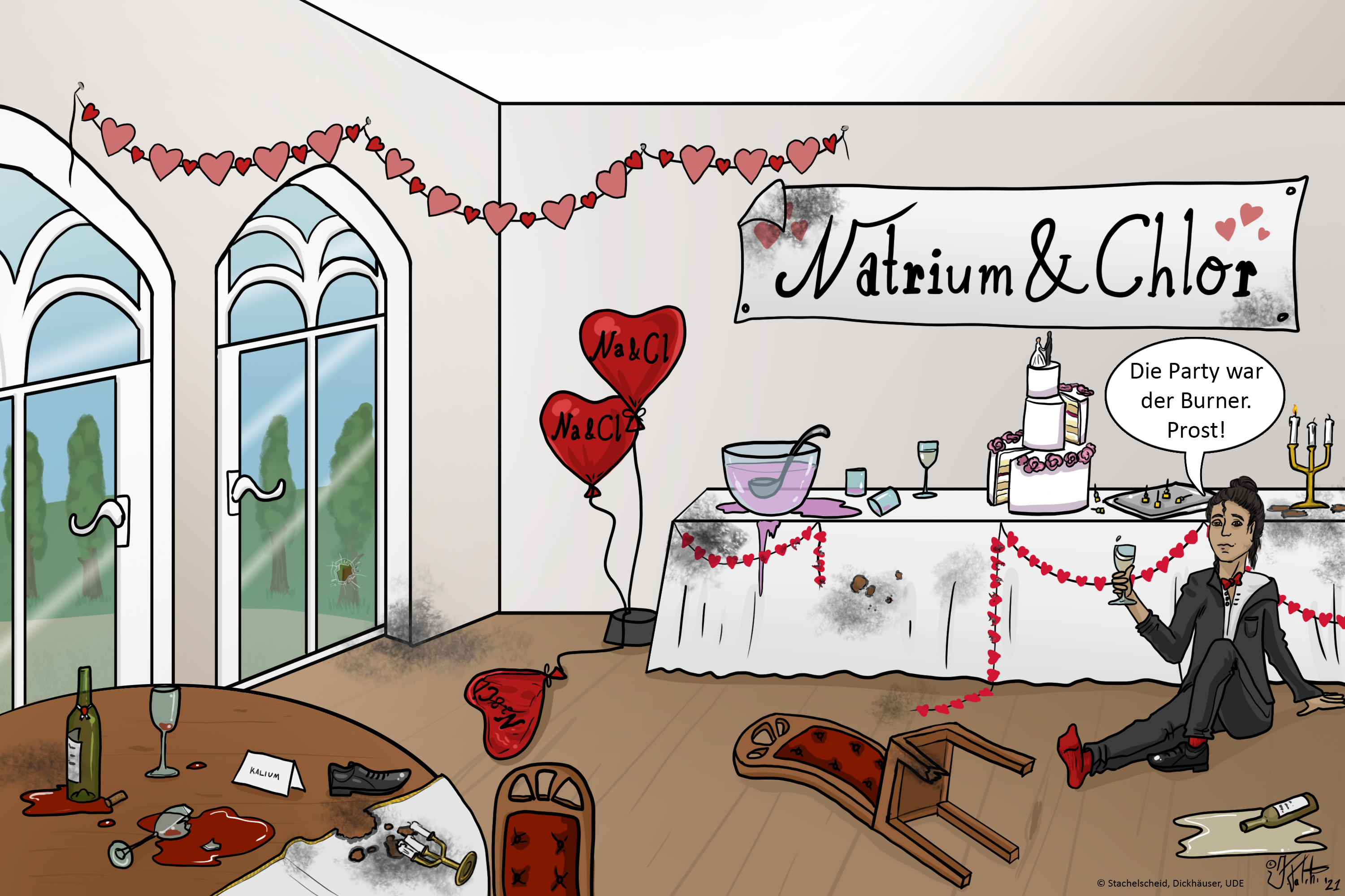 Eine bekannte falsche Vorstellung lässt sich mit Hilfe der Abbildung zur Natriumchloridsynthese diskutieren. Das alltägliche Bezugssystem Hochzeitsfeier mit Braut und Bräutigam - Natrium und Chlor - als atomare Teilchen führt zu dem Brautpaar Natriumchlorid-Teilchen und nicht zum Natriumchloridsalz. Hier kann eine falsche Vorstellung entlarvt und diskutiert werden, die ansonsten allein schon durch die klassische Reaktionsgleichung generiert werden kann.