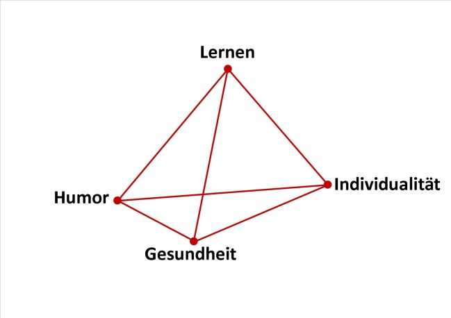 Das Forschungstetraeder stellt die zentralen Forschungsthemen in ihrer Bedeutung für die Arbeitsgruppe dar. Der Schwerpunkt liegt im kognitiven Bereich auf der Unterstützung von Lernprozessen in Naturwissenschaften (speziell Chemie) und Gesundheitsthemen (speziell Sonnenschutz und Ernährung) mit Hilfe von Arbeitsmaterialien mit fachspezifischem Humor. Im affektiven Bereich wird auf der Basis von entsprechendem Wissen eine Beeinflussung von gesundheitsrelevanten Einstellungen und Handlungsabsichten angestrebt.
