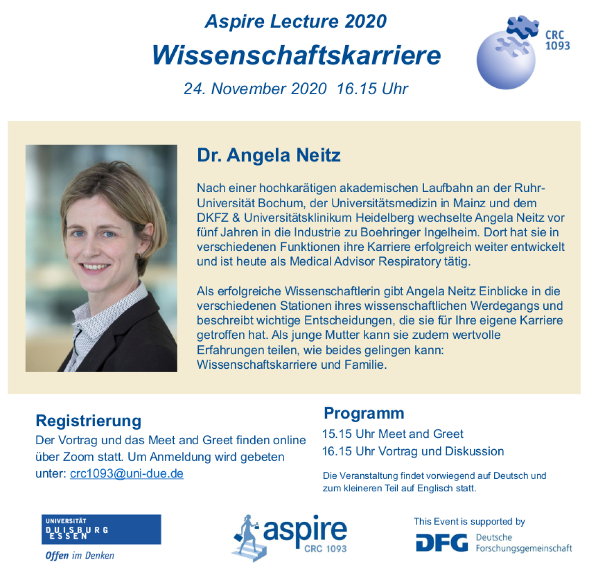 Als erfolgreiche Wissenschaftlerin gibt Angela Neitz Einblicke in die verschiedenen Stationen ihres wissenschaftlichen Werdegangs und beschreibt wichtige Entscheidungen, die sie für Ihre eigene Karriere getroffen hat. Als junge Mutter kann sie zudem wertvolle Erfahrungen teilen, wie beides gelingen kann: Wissenschaftskarriere und Familie.