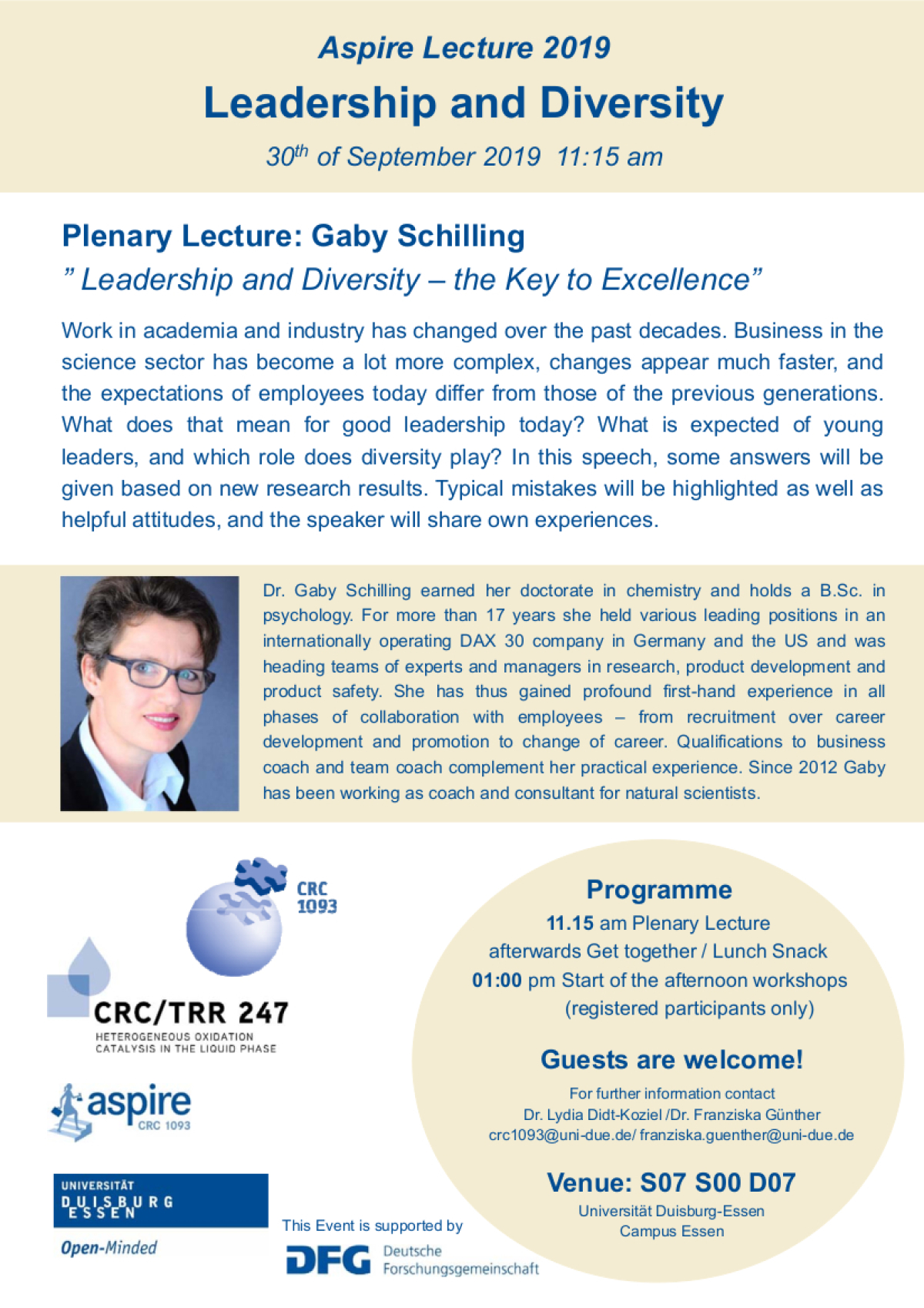 Aspire is a special program for female graduate students within the CRC, offering motivation and support to obtain leading positions in academia, industry and public life. The program combines various formats: Women in leading academic and business positions, who serve as important role models for young female scientists, are invited to deliver lectures and workshops. In addition the program focuses on the topics gender science, equal opportunities and balancing of family and scientific career. Another emphasis is placed on coaching measures, networking and training of key qualifications.