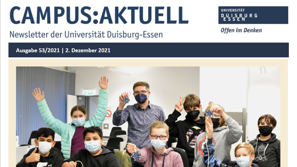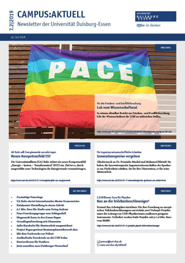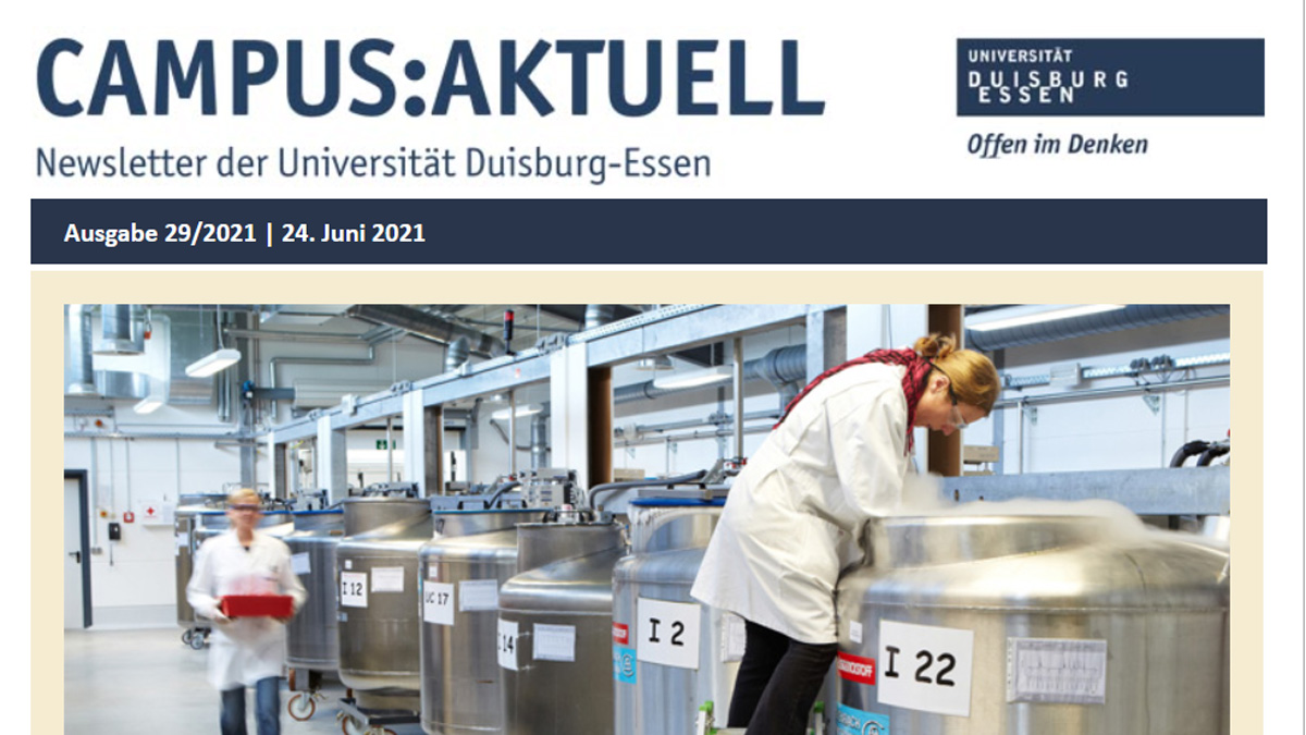 Den Newsletter der UDE gibt´s extern auf Wunsch per E-Mail: Abonnieren Sie CAMPUS:AKTUELL [hier] (Listenname: campusaktuell).