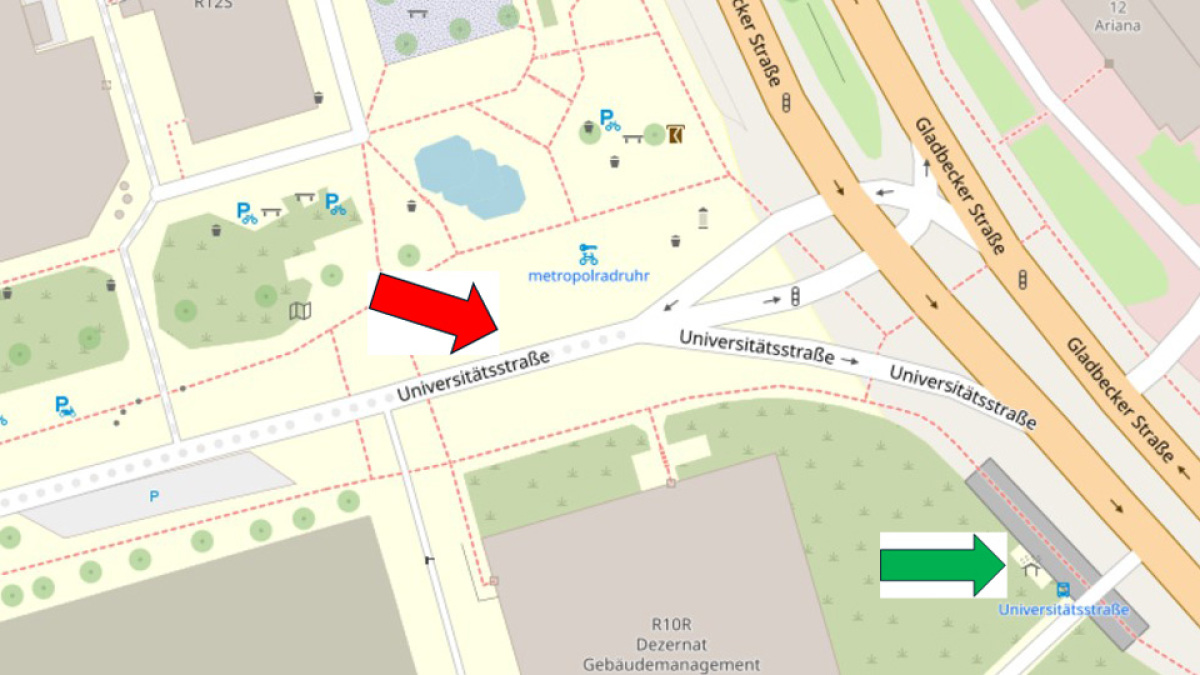 Als Ersatzhaltestelle nutzen Sie bitte die Haltestelle "Universitätsstr." (grüner Pfeil unten) der Ruhrbahn, die sich auf der Gladbecker Straße befindet.