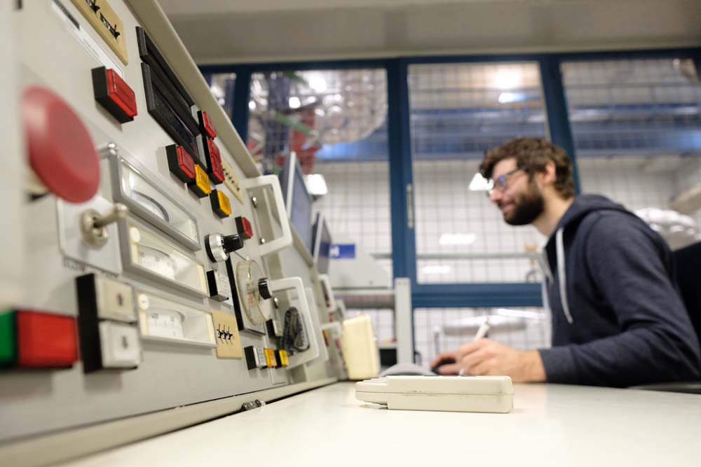 Ingenieur Jörg Honerla und seine Kollegen vom Fachbereich Energietransport- und Speicherung kümmern sich um das UDE-Hochspannungslabor. 20 x 20 Meter ist das 30 Jahre alte akkreditierte Prüflabor groß. Blitzspannungsgenerator, Wechselspannungskaskade, Messteiler und Schutzelektronen ragen in die 16 Meter hohe Halle.