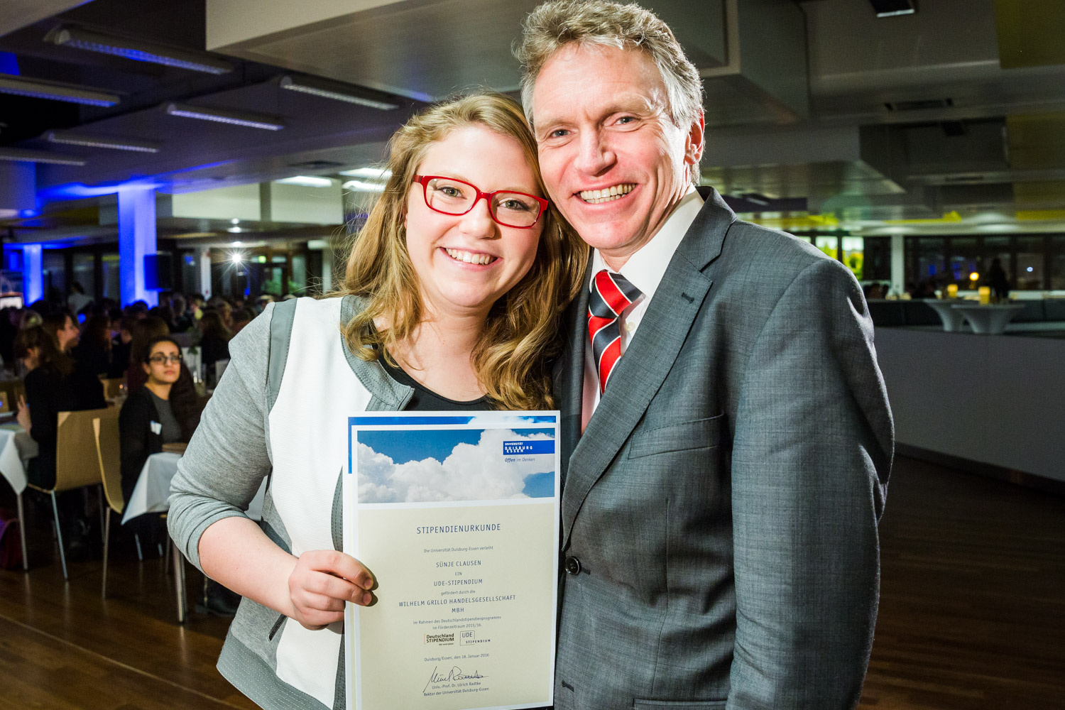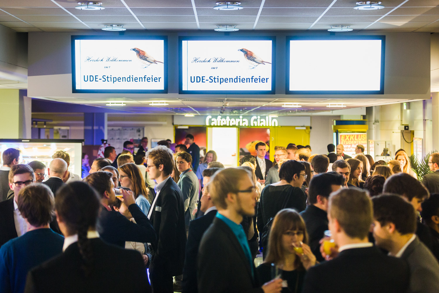 Ein unbekannter Wohltäter, der den eigenen Träumen Flügel verleiht. Solche Wünsche erfüllen sich an der Universität Duisburg-Essen. Allerdings bleibt der Förderer nicht anonym: Die derzeit 350 Deutschland-Stipendiaten lernten bei der alljährlichen Stipendienfeier am 18. Januar 2016 ihre Unterstützer kennen – bei einem stilvollen Abendessen in der Essener Mensa.