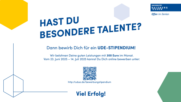 Die Bewerbungsphase für das UDE-Stipendium (Förderzeitraum 2025/2026) ist beendet. Wir bedanken uns für die zahlreichen Bewerbungen und heißen alle anderen Studierenden willkommen, sich im Sommer 2026 erneut zu bewerben!