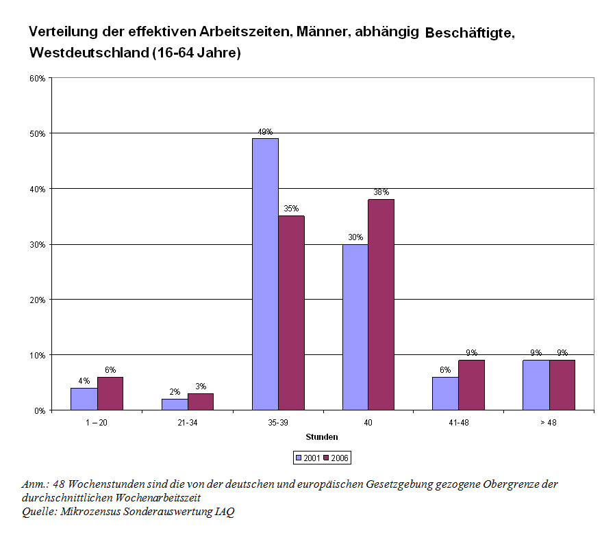 Die durchschnittlichen Arbeitszeitverlängerungen sind vor allem darauf zurückzuführen, dass viele Beschäftigte zur 40-Stunden-Woche zurückgekehrt sind, die zuvor von den tarifvertraglichen Arbeitszeitverkürzungen profitiert hatten. So arbeitete zum Beispiel zu Beginn dieses Jahrzehnts jeder zweite männliche Arbeitnehmer Westdeutschlands zwischen 35 und 39 Wochenstunden, 2006 nur noch jeder dritte. Dem standen zu diesem Zeitpunkt 38 Prozent der abhängig Beschäftigten mit einer tatsächlichen 40-Stunden-Woche gegenüber, und 18 Prozent mit einer Arbeitszeit von über 40 Wochenstunden. Grundsätzlich liegen bei den Vollzeitbeschäftigten die deutschen Wochenarbeitszeiten im Durchschnitt der EU. Die Arbeitszeiten von Frauen in Teilzeit dagegen sind in keinem Land der EU so kurz wie in Deutschland.