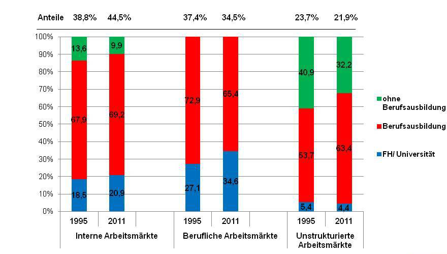 Ein Foto zu dieser Pressemitteilung (Bildbeschreibung: Interne, berufliche und unstrukturierte Arbeitsmärkte und berufliche Bildung 1995- 2011 in Prozent