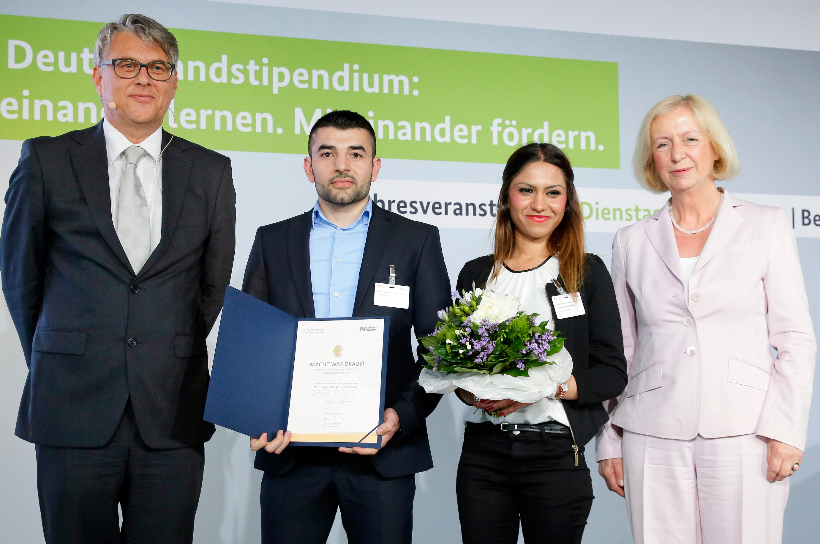 Ein Foto zu dieser Pressemitteilung (Bildbeschreibung: Bei der Preisverleihung in Berlin (v.l.n.r.): Dr. Volker Meyer-Guckel, stellv. Generalsekretär des Stifterverbandes für die Deutsche Wissenschaft, Agit Kaidy, Amanda Bajramovski, Prof. Dr. Johanna Wanka, Bundesministerin für Bildung und Forschung, Foto: Thomas Koehler/photothek.net) können Sie herunterladen unter: