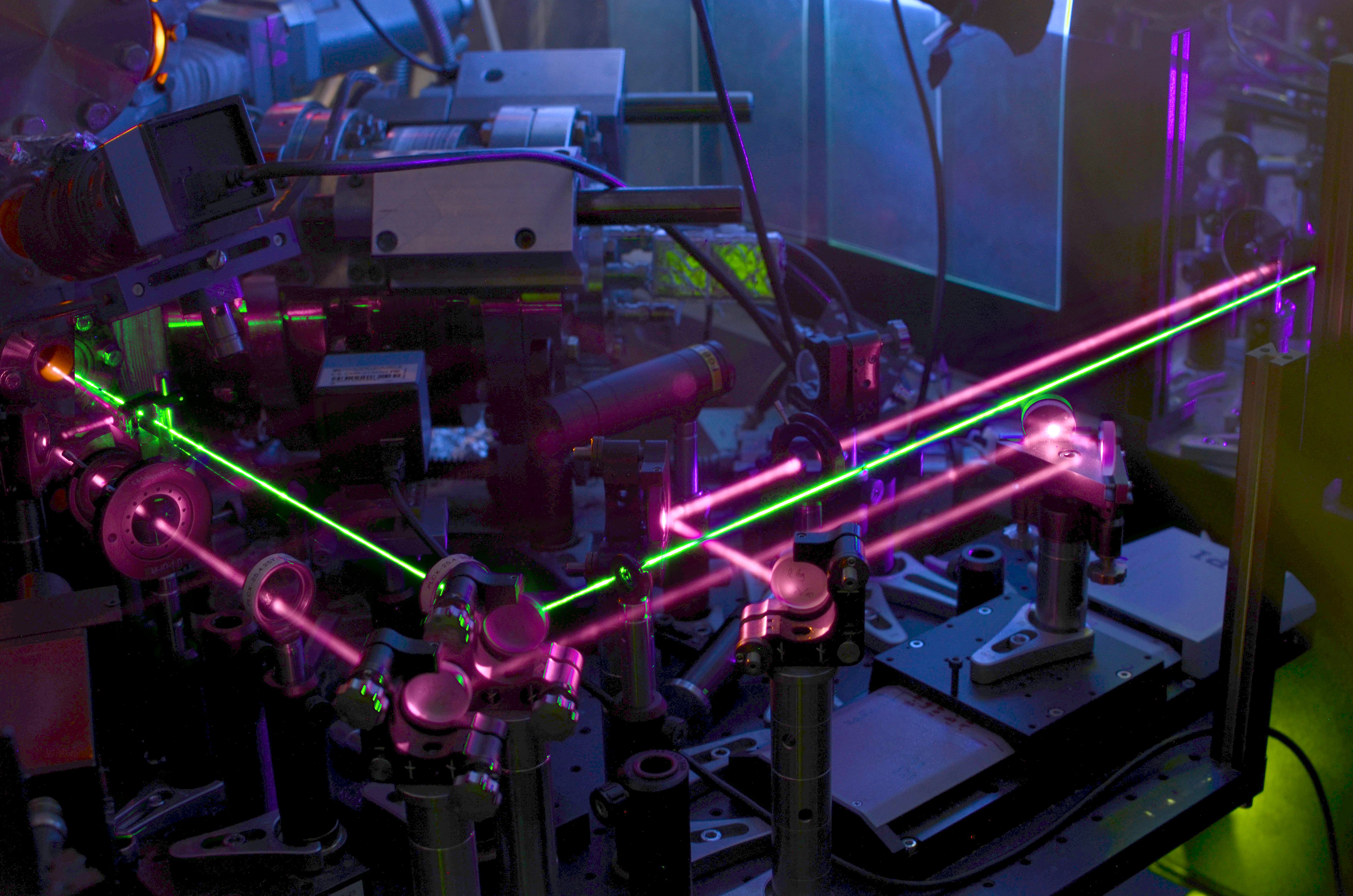 Ein Foto zu dieser Pressemitteilung (Bildbeschreibung: Im Versuchsaufbau erscheinen die zwei Laserstrahlen durchgehend, weil sie sich mit Lichtgeschwindigkeit bewegen – tatsächlich sind es aber wenige Billiardstel einer Sekunde lange Lichtpulse. Mit dem roten Laser wird die Probe angeregt, abgefragt wird mit UV-Licht. Da Letzteres für das menschliche Auge nicht sichtbar ist, wird es im Foto durch den grünen Strahl ersetzt. (Fotonachweis: AG Bovensiepen, UDE)) können Sie herunterladen unter: