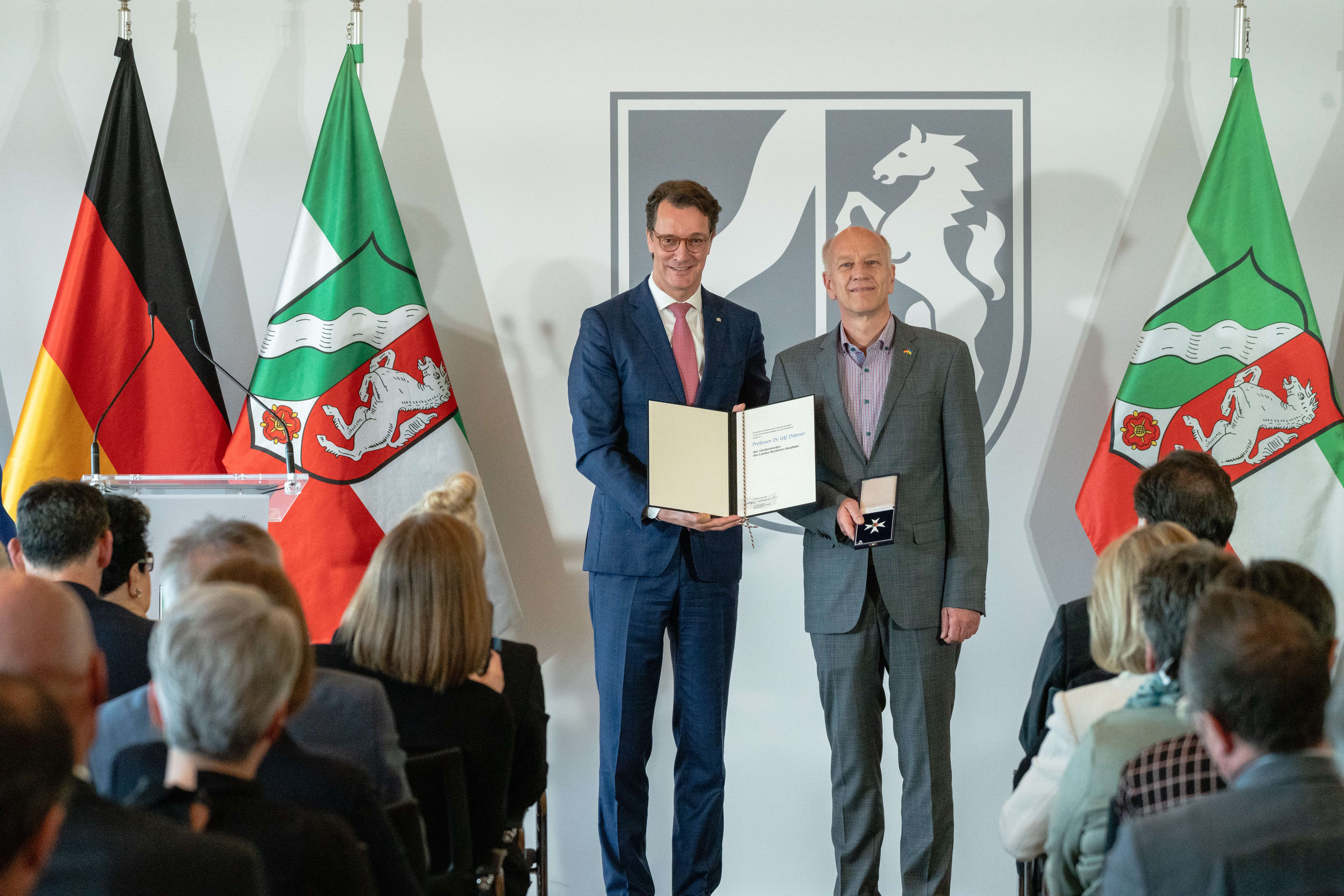 (v.l.) Prof. Dr. Stephan Barcikowski, Essens OB Thomas Kufen, NRW-Wissenschaftsministerin Ina Brandes, Kanzler Ulf Richter, Rektorin Prof. Dr. Barbara Albert.