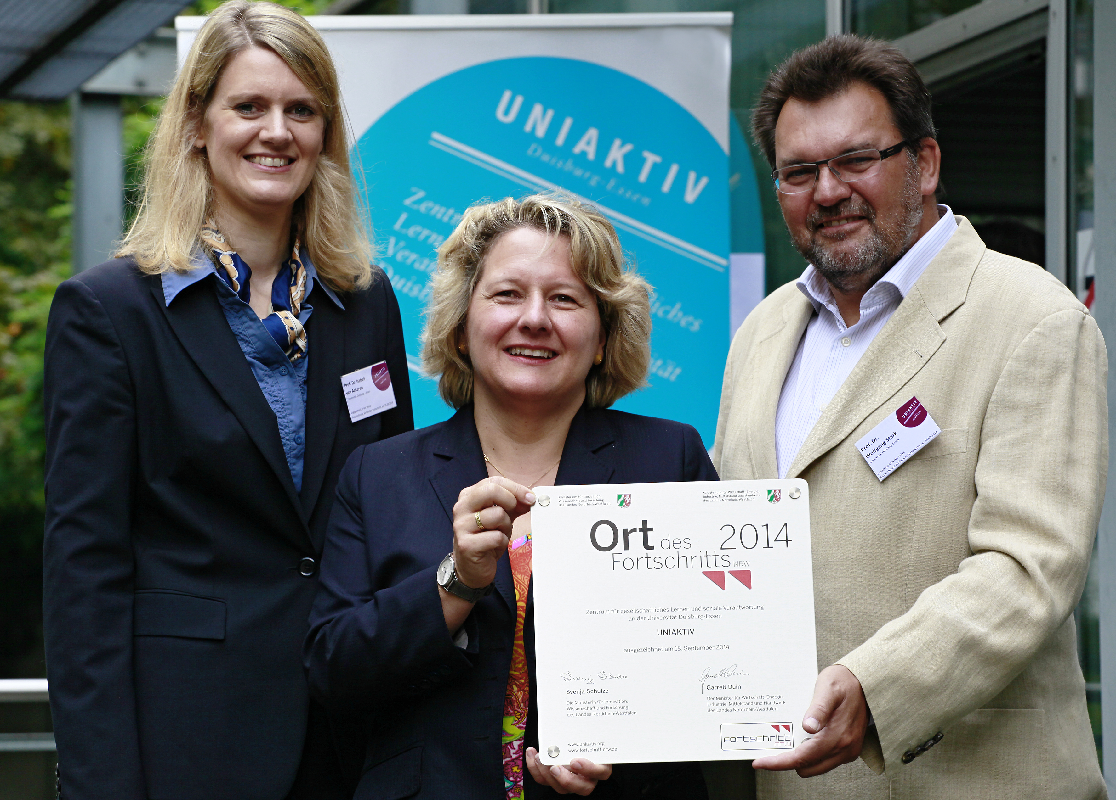 UNIAKTIV als Ort des Fortschritts Isabell van Ackeren, Svenja Schulze und Wolfgang Stark (© Dominic Krause/UNIAKTIV)