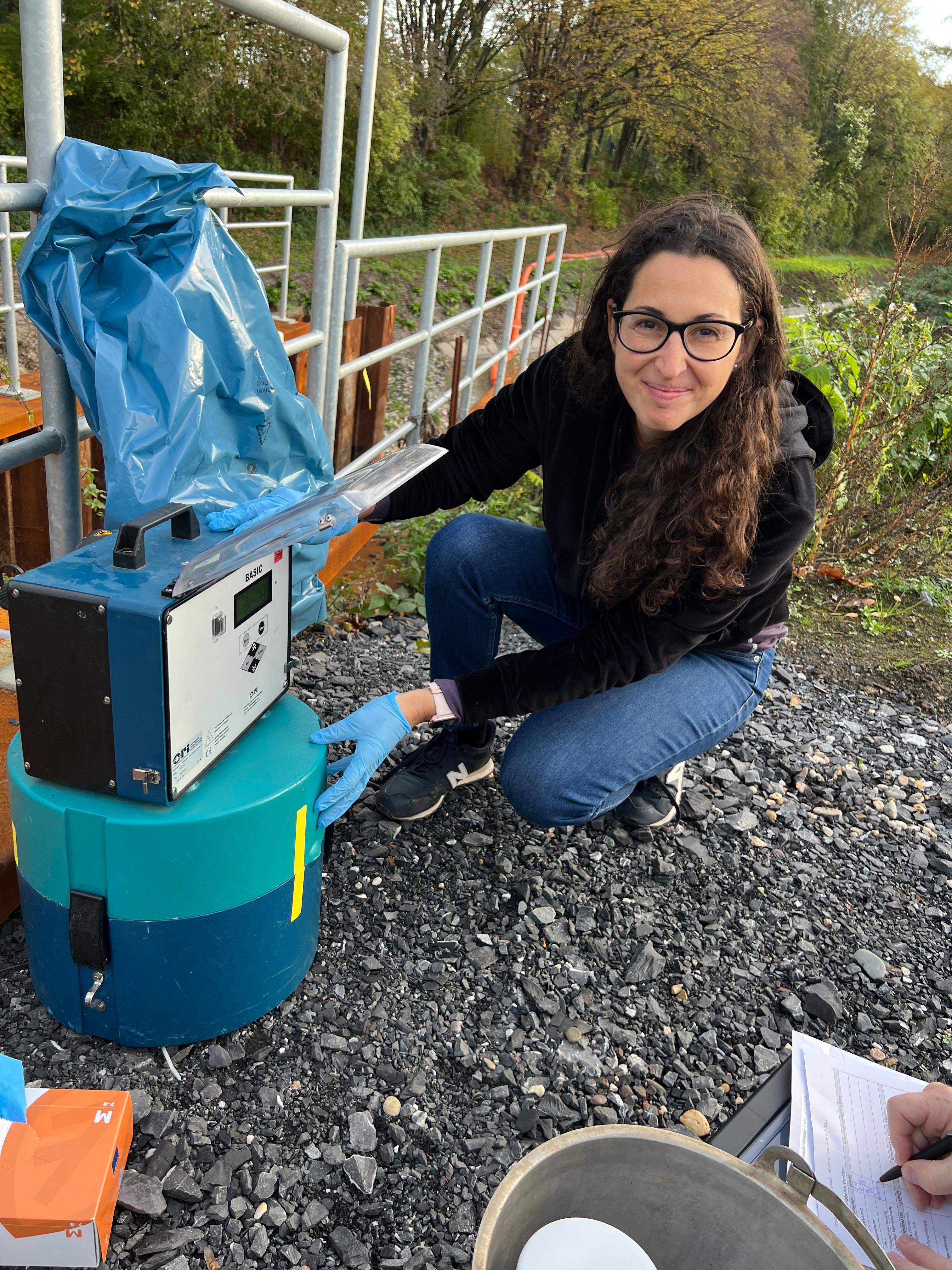 Dr. Kraiselburd, Laborleiterin des Sequencing Labors des IKIM, AG Data Science, entnimmt Abwasserproben mit einem automatischen Abwassersampler (zur Verfügung gestellt durch die Emschergenossenschaft).