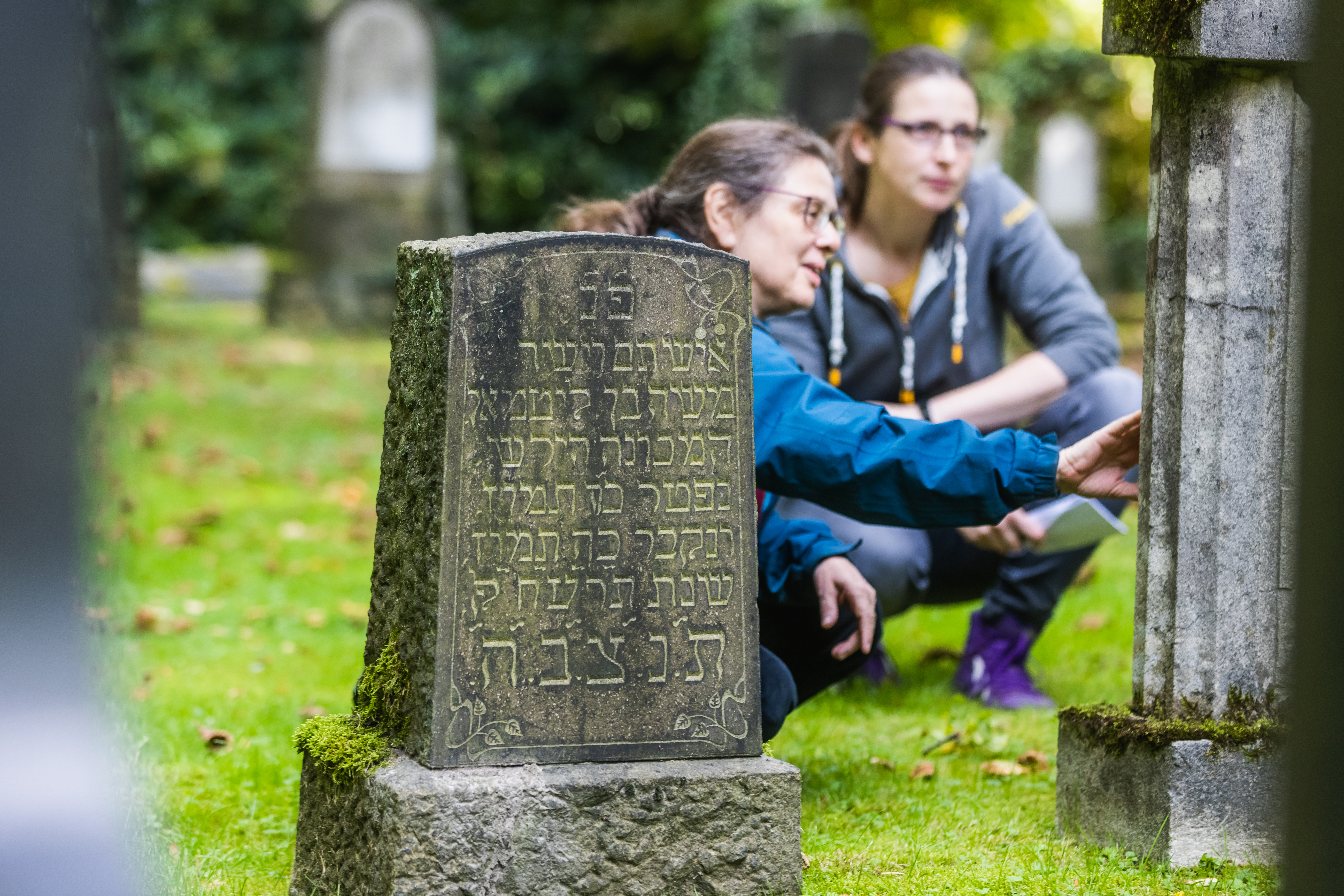 Zwei Mitarbeiterinnen des Steinheim-Instituts untersuchen eine Grabinschrift auf dem jüdischen Friedhof in Essen-Segeroth.