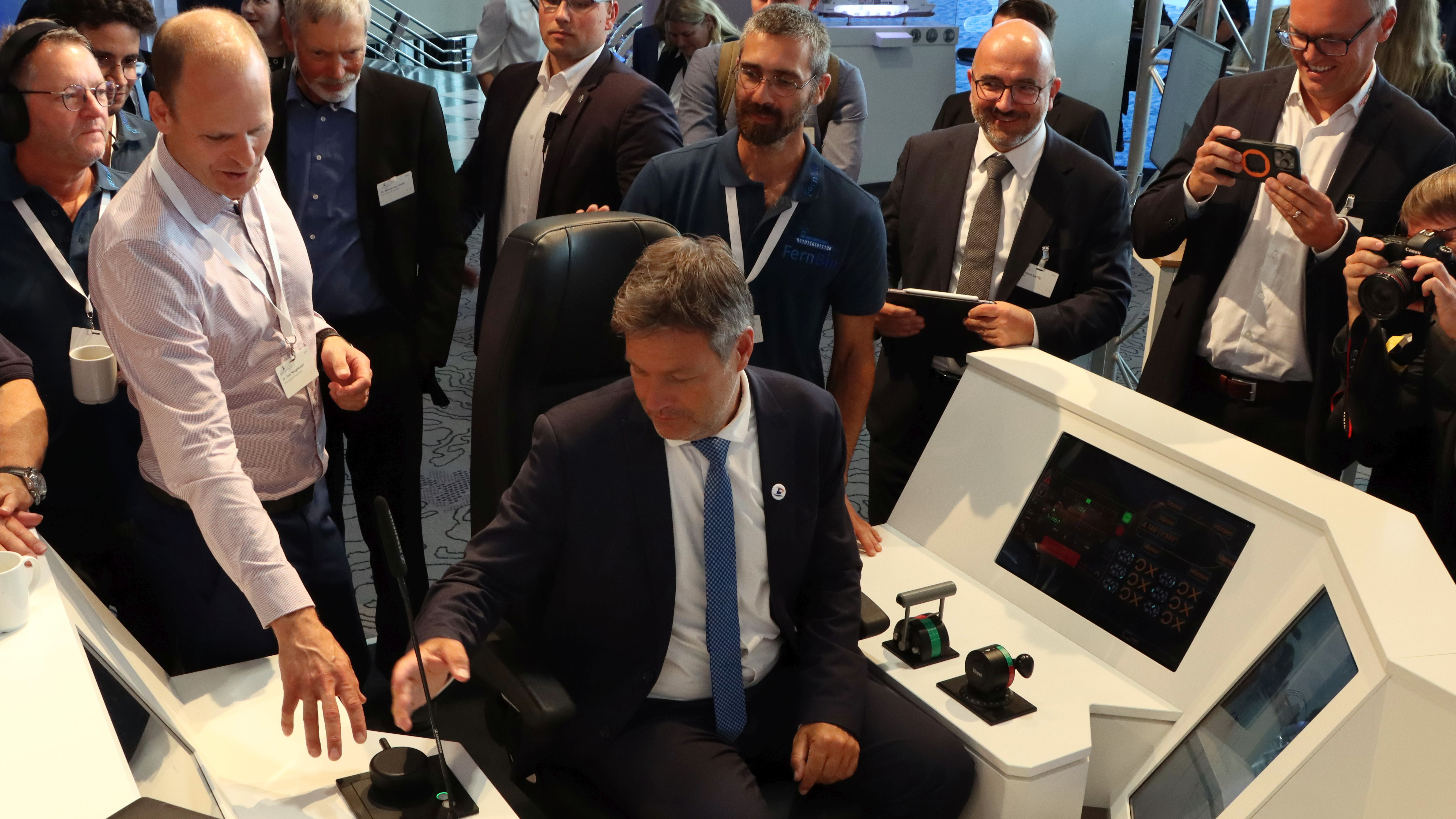 Duisburger Schiffsbauer:innen demonstrieren ferngesteuertes Fahren Robert Habeck am FernBin-Steuerstand