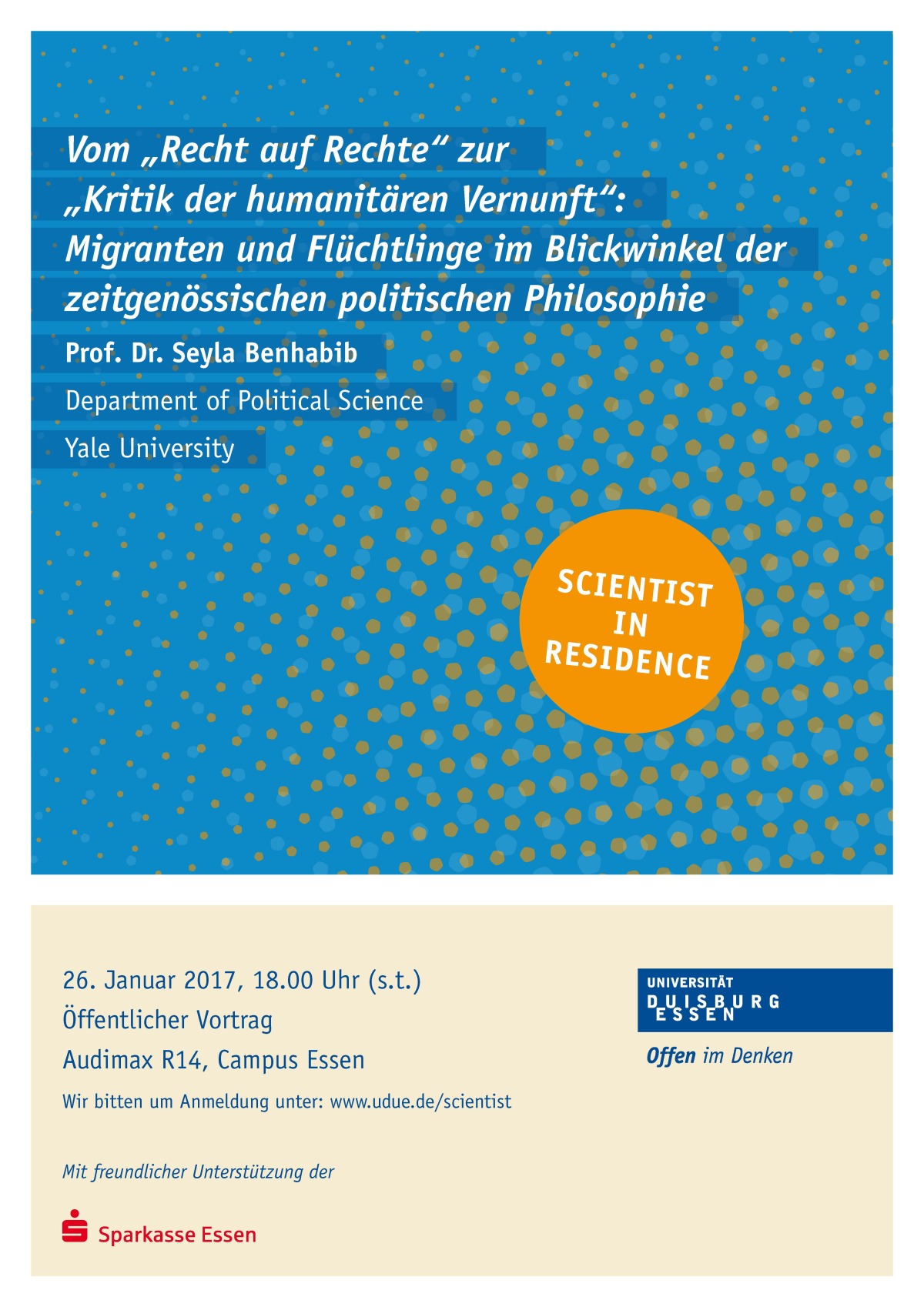 Der Scientist in Residence im Wintersemester 2016/17 wurde vom Rektorat der Universität Duisburg-Essen nominiert. Die Auszeichnung erhielt Prof. Dr. Seyla Benhabib von der Yale University. Sie ist Professorin für Politische Theorie und Philosophie und renommierte Expertin im Bereich der Forschung zu Migration und Globalisierung. Im Zusammenhang mit ihrer Gastprofessur besuchte Prof. Dr. Seyla Benhabib auch das „Interdisziplinäre Zentrum für Integrations- und Migrationsforschung“ (InZentIM) der Universität Duisburg-Essen.