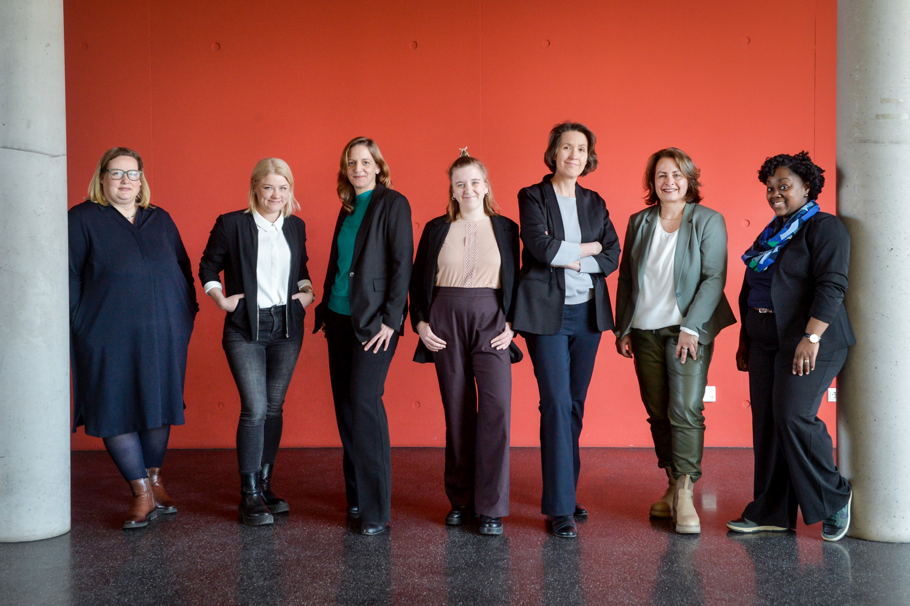 Foto v.l.n.r.: Mirke Maenz (Campusleitung DU-E-KIDS Duisburg), Alexandra Spoden, (Stellvertretende Leitung Familienservice & DU-E-KIDS), Corinna Steffens (Office Management), Marie Köstering (Koordinatorin Inklusion), Regina Hauses (Leitung DSC & Leitung Ressort Vielfalt), Mahdesta Knauf (Leitung Ressort Vereinbarkeit & Leiterin Familienservice und DU-E-KIDS), Hayfat Hamidou-Schmidt (Antidiskriminierungsbeauftragte & Leitung Ressort Vielfalt)