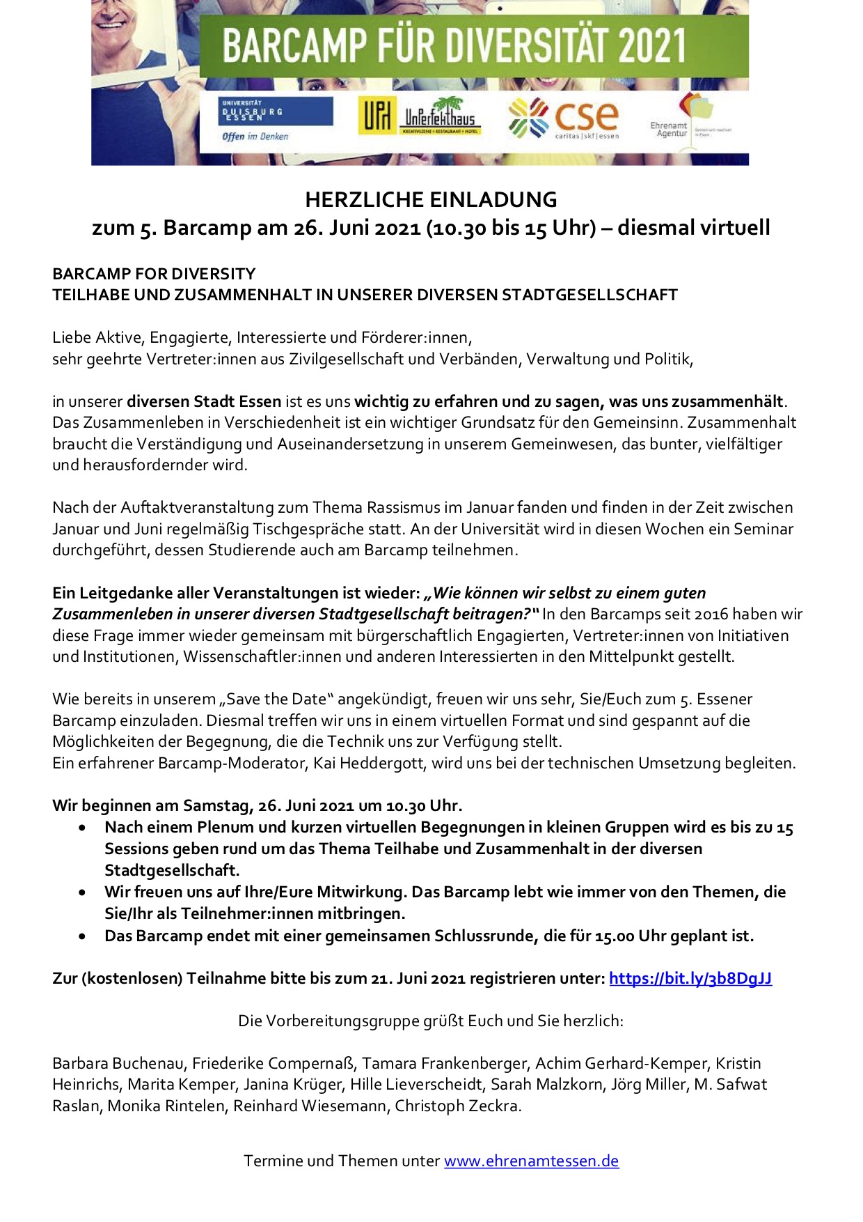 • Wir freuen uns auf Ihre Mitwirkung. Das Barcamp lebt wie immer von den Themen, die Sie als Teilnehmer*innen mitbringen.