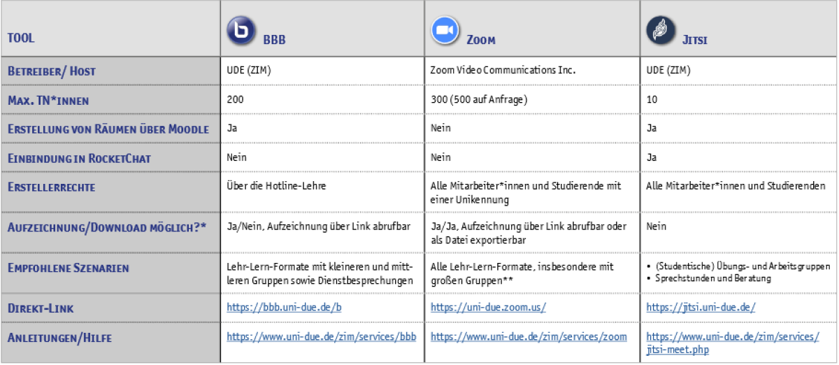 - Als Videokonferenzsystem bietet die UDE derzeit Zoom und BigBlueButton (BBB) an, um Studierende online einzubinden. Wir haben bezüglich der Funktionalitäten einen Vergleich der Videokonferenz-Systeme erstellt. Schicken Sie den Studierenden frühzeitig die Zugangsinformationen und berücksichtigen Sie den Schutz Ihrer Zoom-Session vor unbefugtem Zugang.