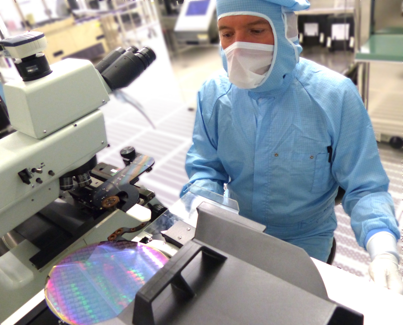 The close cooperation with Fraunhofer IMS gives us access to a modern cleanroom infrastructure for the production of photonic structures on 200 mm wafers, which are manufactured using a 350 nm technology node and 248 nm DUV lithography. Processes for LPCVD and PECVD silicon nitride are available in the cleanroom, including a variant with improved properties in the visible wavelength range, allowing specific requirements to be met. ALD processes for the deposition of photonic materials such as tantalum pentoxide and sputtering systems for the deposition of aluminium nitride are also available. Planarisation options are available for the heterogeneous integration of III-V semiconductor components, for example, and the development of process sequences for the direct integration of photonic structures on electronic circuits is currently in development. This enables us to realise application-specific designs and requirements flexibly and efficiently.