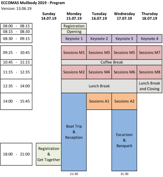 For relaxed registration, a slot on Sunday July 14, 2019, 18:00h-21:00h has been allotted within the Campus Area. The Sunday registration slot will take place at the “Multibody Tent” where the lunches will be offered during the conference. The “Multibody Tent” is only minutes’ walk from the conference lecture rooms and is shown in the conference map. Registration can also take place anytime during the conference at places that will be clearly indicated.