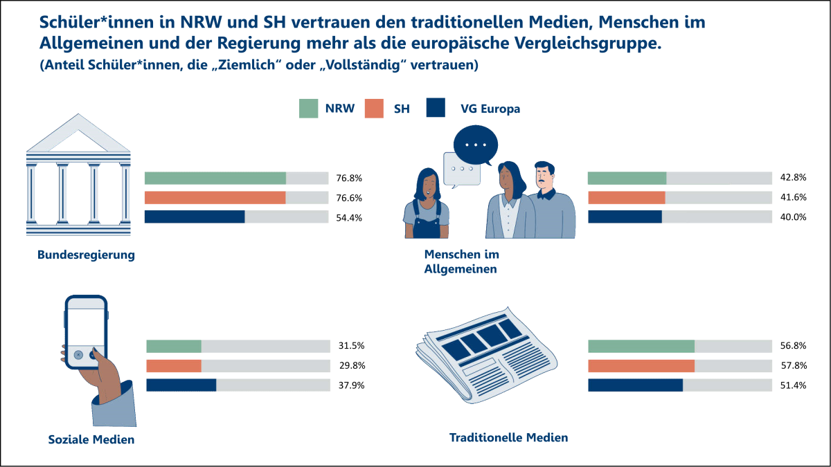 In den Ergebnissen aus ICCS 2022 wird auch der Einfluss der Krisen auf die politische Entwicklung von Jugendlichen deutlich: Zwar vertrauen noch etwa drei Viertel der Schüler*innen der Regierung, den Gerichten oder auch der Polizei, aber dieser Wert ist in Deutschland und international rückläufig. Geringer ist das Vertrauen in Institutionen, die den politischen Diskurs repräsentieren, so äußert etwa zwei Drittel der Schüler*innen ihr Vertrauen gegenüber dem Bundestag und die Hälfte allgemein gegenüber Parteien. Dieses Muster der Zurechnung von Vertrauen zeigt sich auf sehr unterschiedlichem Niveau auch in anderen Ländern. Insgesamt hat sich das Niveau des Vertrauens in Deutschland und international seit der letzten Befragung bei ICCS 2016 um 5-10% abgesenkt. Der Rückgang des Vertrauens ist insbesondere deshalb besorgniserregend, weil Vertrauen eine Ressource zur Bewältigung von Krisen und gesellschaftliche Transformationen ist.