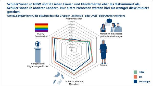 In diesem Punkt lässt die International Civic and Citizenship Education Study (ICCS) 2022 hellhörig werden für die Situation an Schulen, aber auch für die Leistungsfähigkeit des Schulsystems, Schüler*innen bei der Entwicklung ihrer Rolle als Bürger*innen zu unterstützen. Bei der aktuellen Durchführung der Studie haben 24 Bildungssysteme weltweit teilgenommen, darunter 21 aus Europa samt der zwei deutschen Bundesländer Nordrhein-Westfalen und Schleswig-Holstein. Am 28. November wird ein erster Teil der Ergebnisse veröffentlicht. Ein zweiter Ergebnisteil folgt im kommenden Jahr am 22. Februar.
