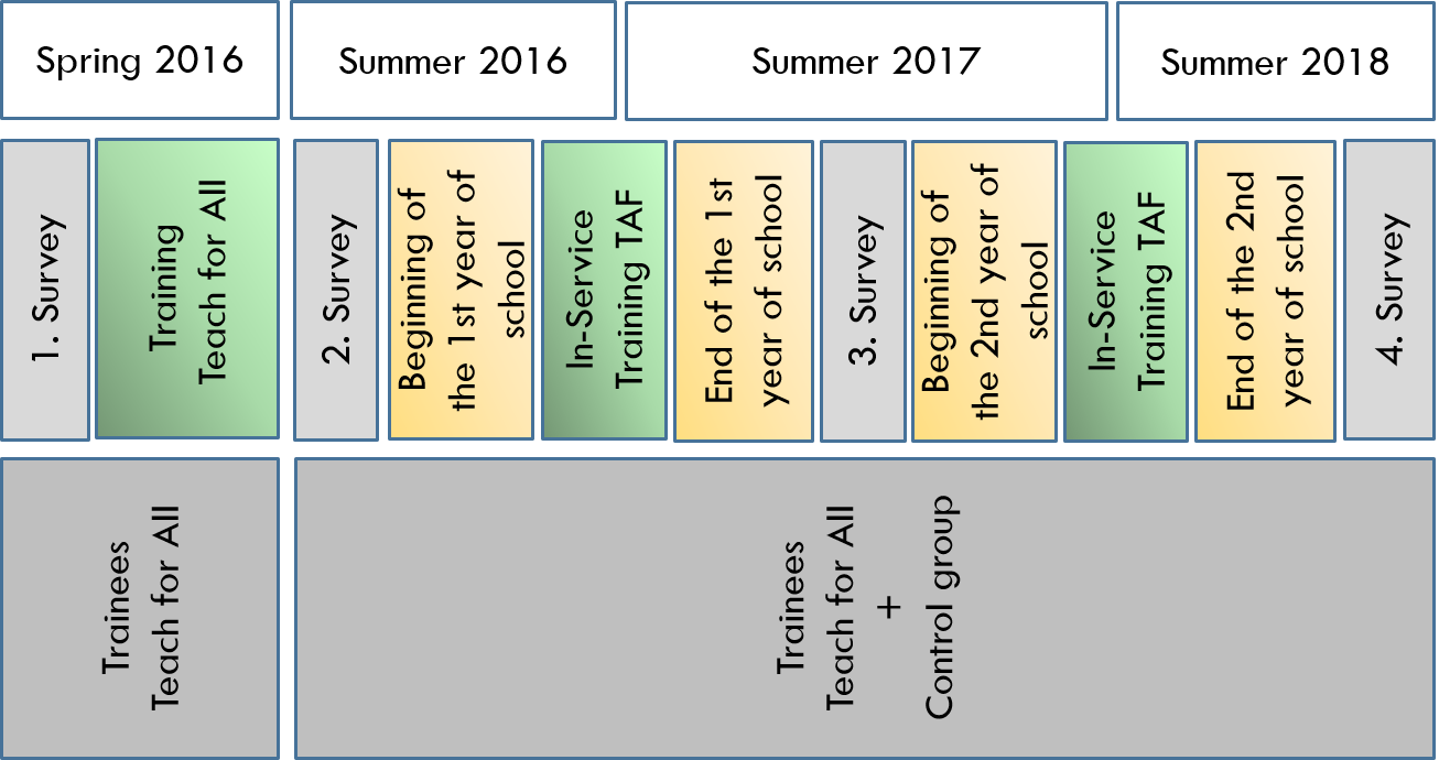 The NEWTT project is based on a quasi-experimental design with four measurement points (see figure 1). The intervention group includes trainees of the alternative teacher education training of Teach for All (TfA), a non-profit non-governmental organization. The control group includes teachers who have successfully completed a university teacher education training. The survey will be conducted via an online questionnaire, which is translated in the respective languages of the countries.