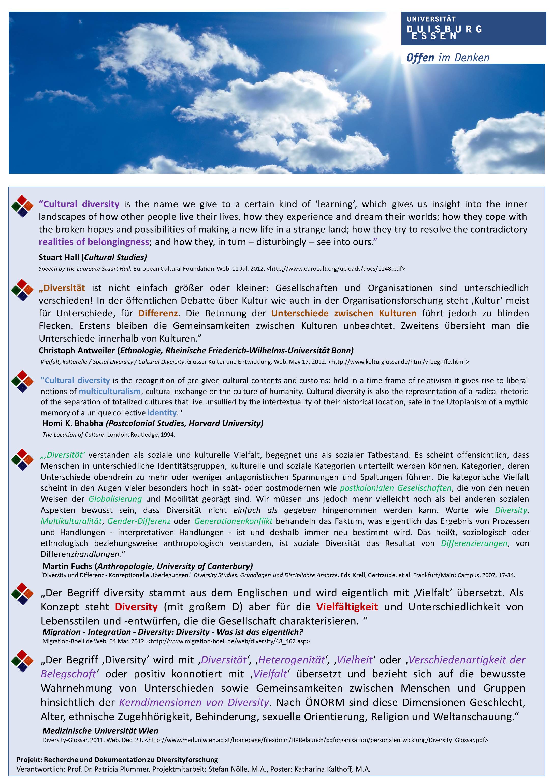Das Projekt "Recherche und Dokumentation zu Diversityforschung" ist Teil der Initiative Diversityforschung an der UDE und bildete eine Grundlage für die weiteren Aktivitäten. Zunächst wurde in einer 'Pilotphase‘ eine eingehende Recherche durchgeführt, in deren Verlauf zunächst die Verwendung des Begriffs "Diversity" (bzw. seiner Synonyme und Teil-Synonyme) in der Forschungsliteratur unterschiedlicher Fächer und Disziplinen gesichtet wurde. Daraus ist eine umfangreiche systematische Bibliographie der in der Universitätsbibliothek der UDE vorhandenen zugehörigen Fachliteratur entstanden (die Ergebnisse finden Sie unten auf dieser Seite zum Download). Darüber hinaus wurden einschlägige Forschungszentren und Studiengänge im In- und Ausland recherchiert. Nach Auswertung zahlreicher Internetseiten aus allen Fakultäten der UDE wurde eine erste Übersicht über mögliche inhaltliche Schwerpunkte der weiteren Arbeit erstellt.