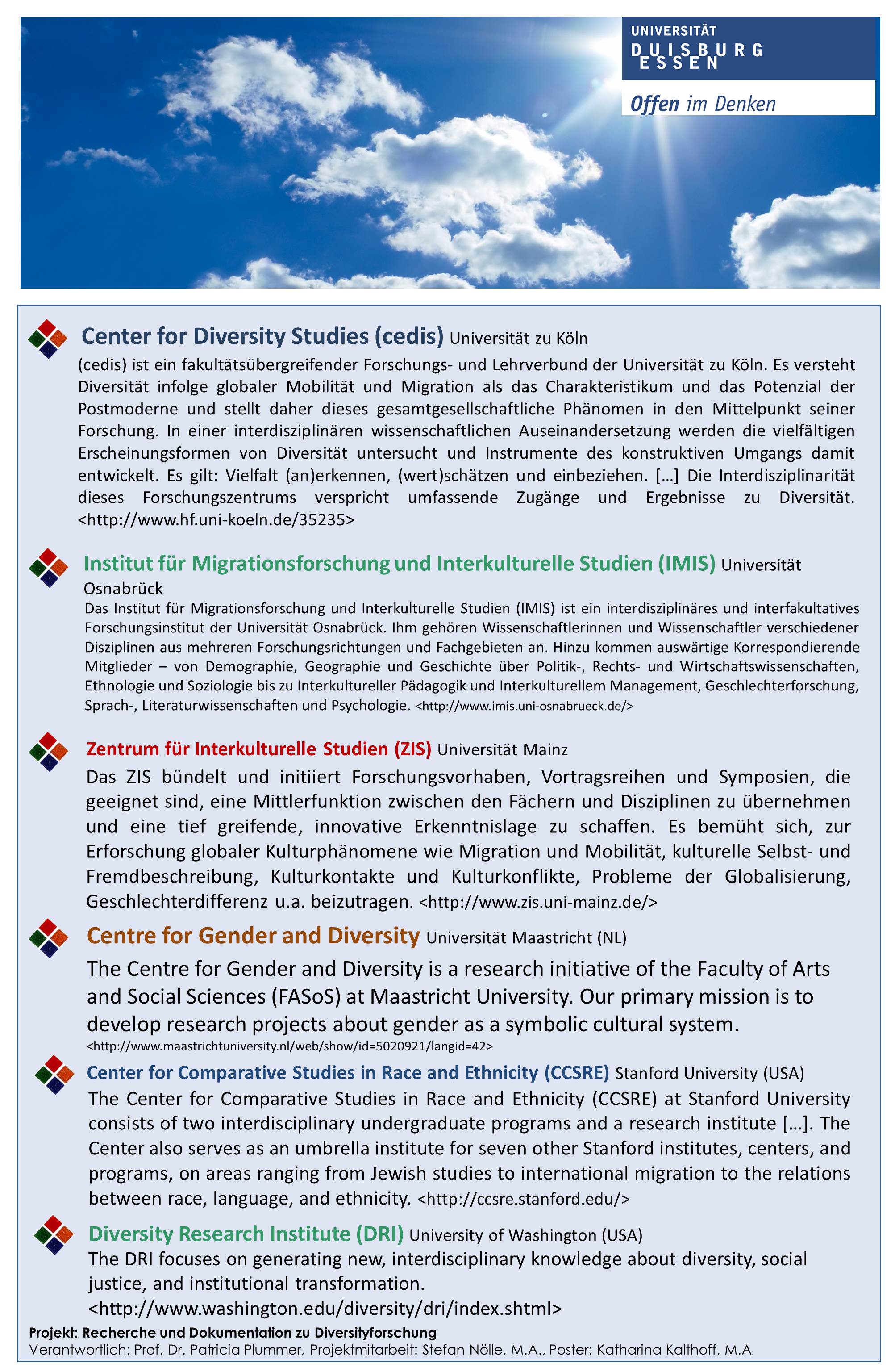 Die o.a. Recherche war zeitlich befristet und bildet den Stand von Oktober 2012 ab; seither sind weitere Forschungszentren, Professuren und Studiengänge mit der Bezeichnung bzw. einem Schwerpunkt im Bereich der Diversityforschung entstanden, die nicht mehr erfasst werden konnten. Dennoch bietet die Recherche eine wichtige erste Übersicht.