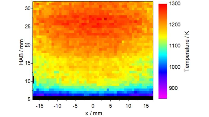 The measurement methods are employed to determine key parameters in flames and other technically relevant environments. A major focus is on imaging techniques that visualize desired quantities across a process cross-section, aiding in the understanding of mixing, reaction, and flow processes. For instance, the thickness and temperature of aqueous liquid films are measured using absorption spectroscopy with tunable NIR diode lasers to observe rapidly evaporating liquid films on hot surfaces in a time-resolved manner. Another example is the non-contact quantitative determination of heat release in turbulent flames using imaging LIF of OH and formaldehyde, as well as time- and spectrally resolved chemiluminescence (OH*, CH*, CO2*).