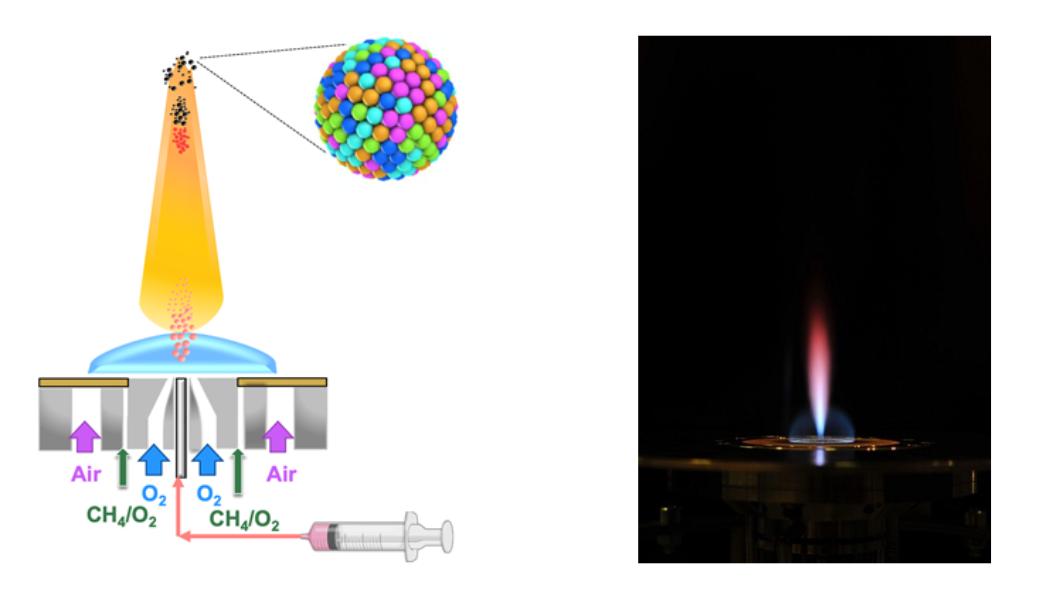 As a continuous synthetic technique, important material characteristics such as phase composition, particle size distribution, surface area, stoichiometric ratio, etc. can be adjusted and kept constant throughout the reaction. The initial metal precursors are cheap and readily available nitrates. On the other hand, solvents can be anything from ethanol to non-polar toluene. Depending on the nature of the desired materials, the precursors, solvents, and fuels (e.g. methane, oxygen flame), reactor pressure etc., can be tuned.