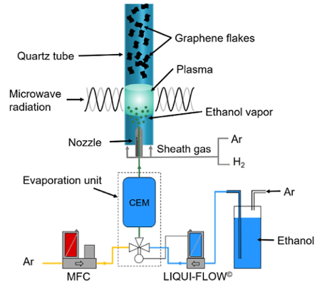 Microwave-assisted gas-phase synthesis of graphene, as a continuous process, is one of the most scalable production routes for obtaining substrate-free graphene flakes for high-quality material. Plasmas provide highly energetic environments by the presence or formation of radicals, ions, and electrons. In a microwave plasma reactor (Figure 1), the precursors enter the coupler region and decompose into smaller reactive fragments, such as C, H, H2, C2, C2H2, and CO. These species then flow into a colder nucleation zone, where they react to form nuclei that rapidly grow into graphene.