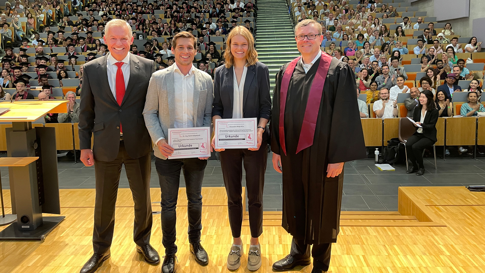 Anläßlich des Thermodynamik-Kolloquiums 2024 in Stuttgart wurde Frau Alexandra Welp, M.Sc. von Herrn Prof. Dr. Roland Span der Posterpreis für ihren Beitrag "Fluidauswahl für Hochtemperaturwärmepumpen: Strategie zur Eingrenzung der Zusammensetzung ternärer Gemische" verliehen.