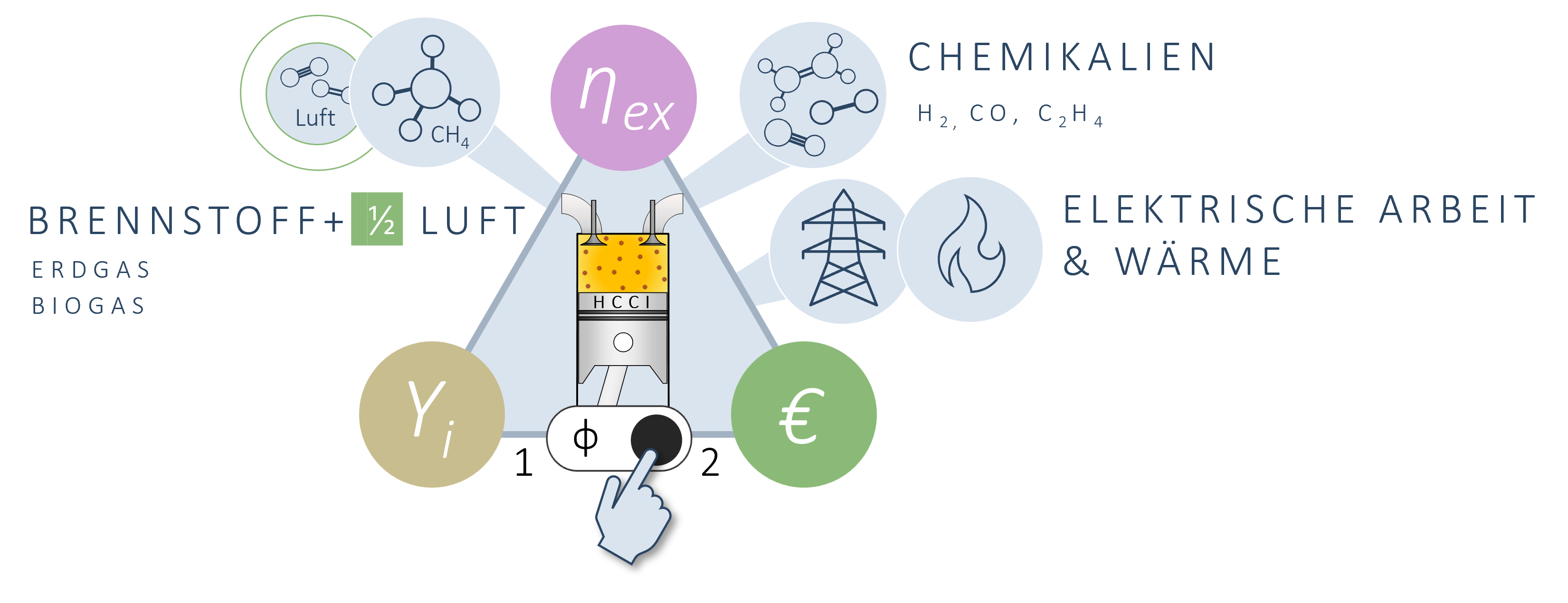 Verbrennungsmotoren können brennstoffreich betrieben werden, wodurch anstelle von Abgasen wertvolle, chemikalienhaltige Produktgase entstehen. Am Lehrstuhl für Thermodynamik werden hierfür Motormodelle entwickelt und anhand von experimentellen Daten validiert. Außerdem werden Prozesskonzepte entwickelt, welche die Abtrennung der Chemikalien, beispielsweise Wasserstoff, berücksichtigen.