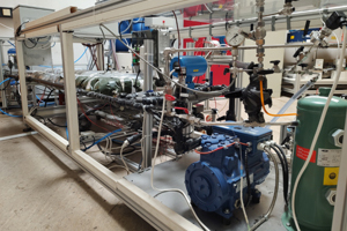 Der Lehrstuhl für Thermodynamik lädt Sie in das Kompressions-Wärmepumpenlabor ein! In der von uns gebauten Forschungsanlage mit viel Sensorik wird insbesondere der Einfluss von Arbeitsfluiden (Kältemittel) auf die Leistungszahl untersucht. Vor allem geht es um die Wechselwirkung in den verschiedenen Anlagenteilen Kompressor, Drossel und Wärmeübertrager. Neben der Untersuchung vieler Fluide und Fluidgemische mit geringem Treibhauspotential, untersuchen wir auch den Übergang zu höherem Temperaturhub, wie es z.B. in älteren Gebäuden benötigt wird, da dort keine Fußbodenheizungen vorhanden sind.